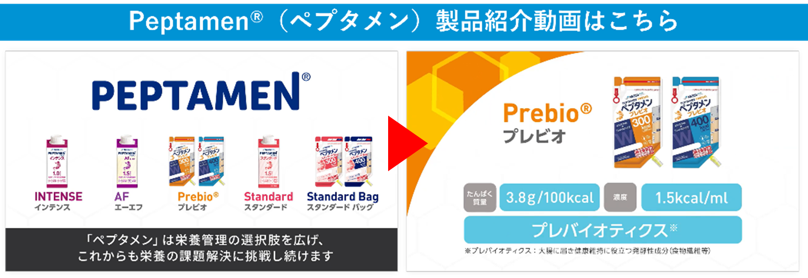 「ペプタメン プレビオ」は、乳清(ホエイ)ペプチドと、食物繊維を含有しており、疾患などにより通常の食事で十分な栄養を摂ることが困難な方々が、より安心して生活できることを目指しています。総合栄養食品の理解と使用方法の普及を通じて、栄養療法の選択肢を広げ、さまざまな栄養の課題に取り組んでいきます。
