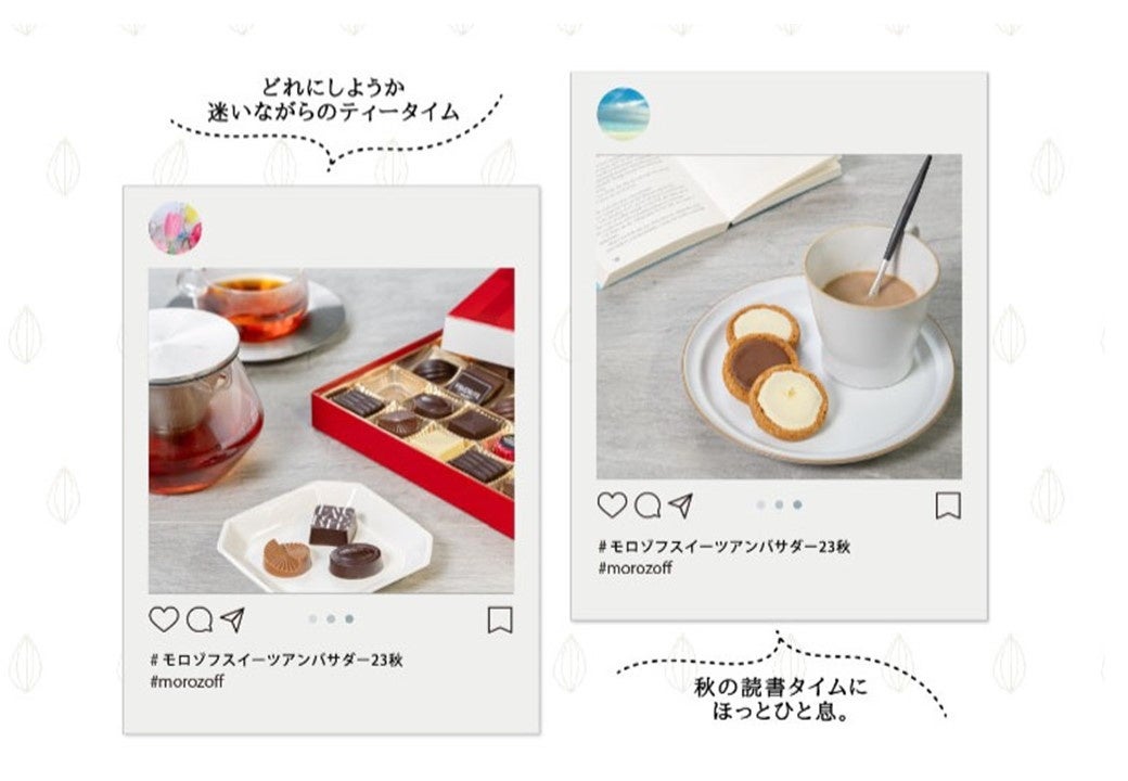 ②指定の期間中に届いた商品を各1回以上、アンバサダーご自身のアカウントで「#モロゾフチョコレートアンバサダー23秋冬」 「#morozoff」のハッシュタグとモロゾフ公式アカウント(@morozoff_sp)を タグ付けして、ご紹介頂きます。