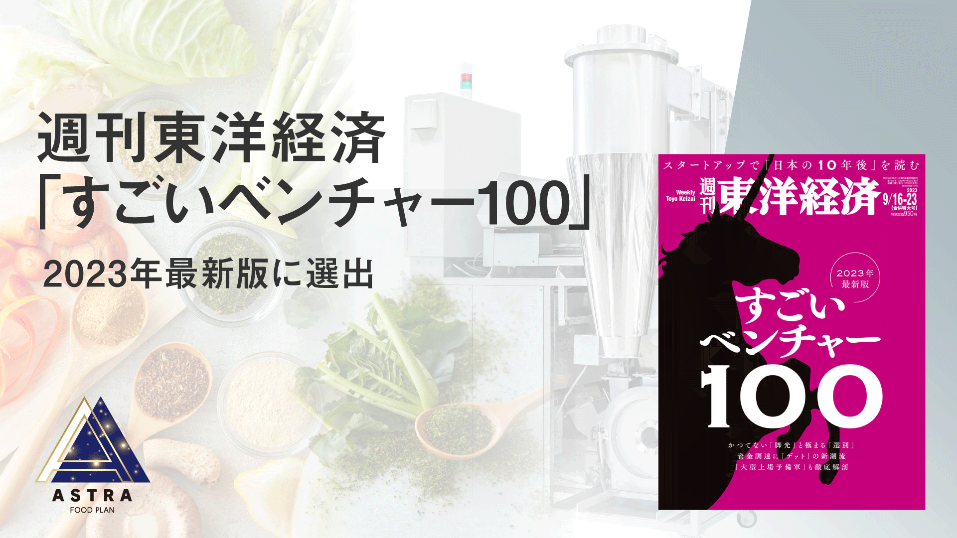 2023年9月11日(月)発売の「週刊東洋経済 2023年9/16・9/23合併特大号」において発表される「【特集】すごいベンチャー100 2023年最新版」で、「食品・農業」カテゴリにおいてASTRA FOOD PLANが選出されました。また100社のうちの「すごいベンチャー編集部厳選7社」にも選出されています。