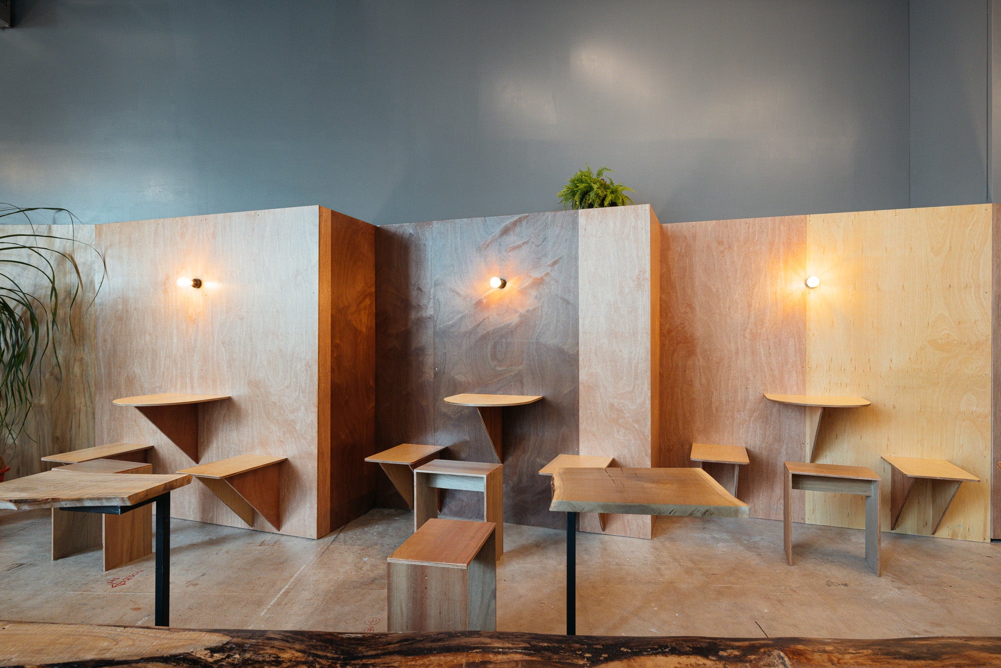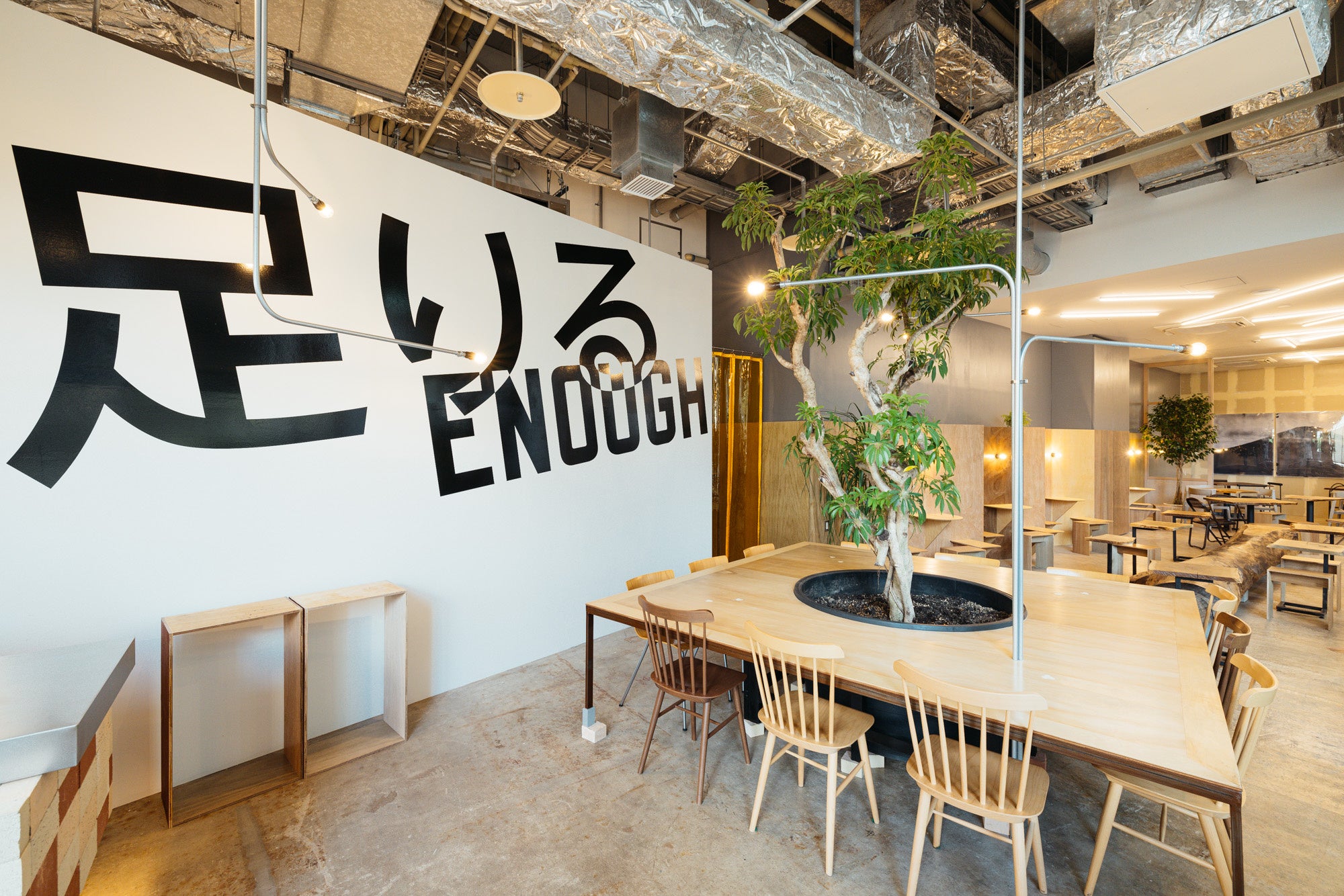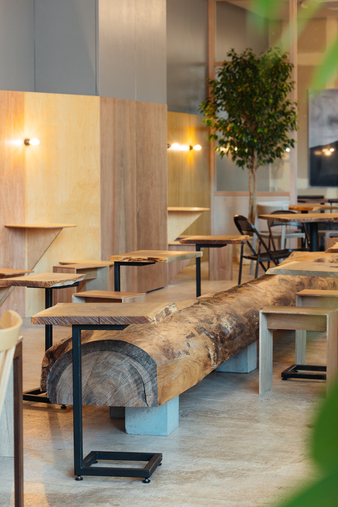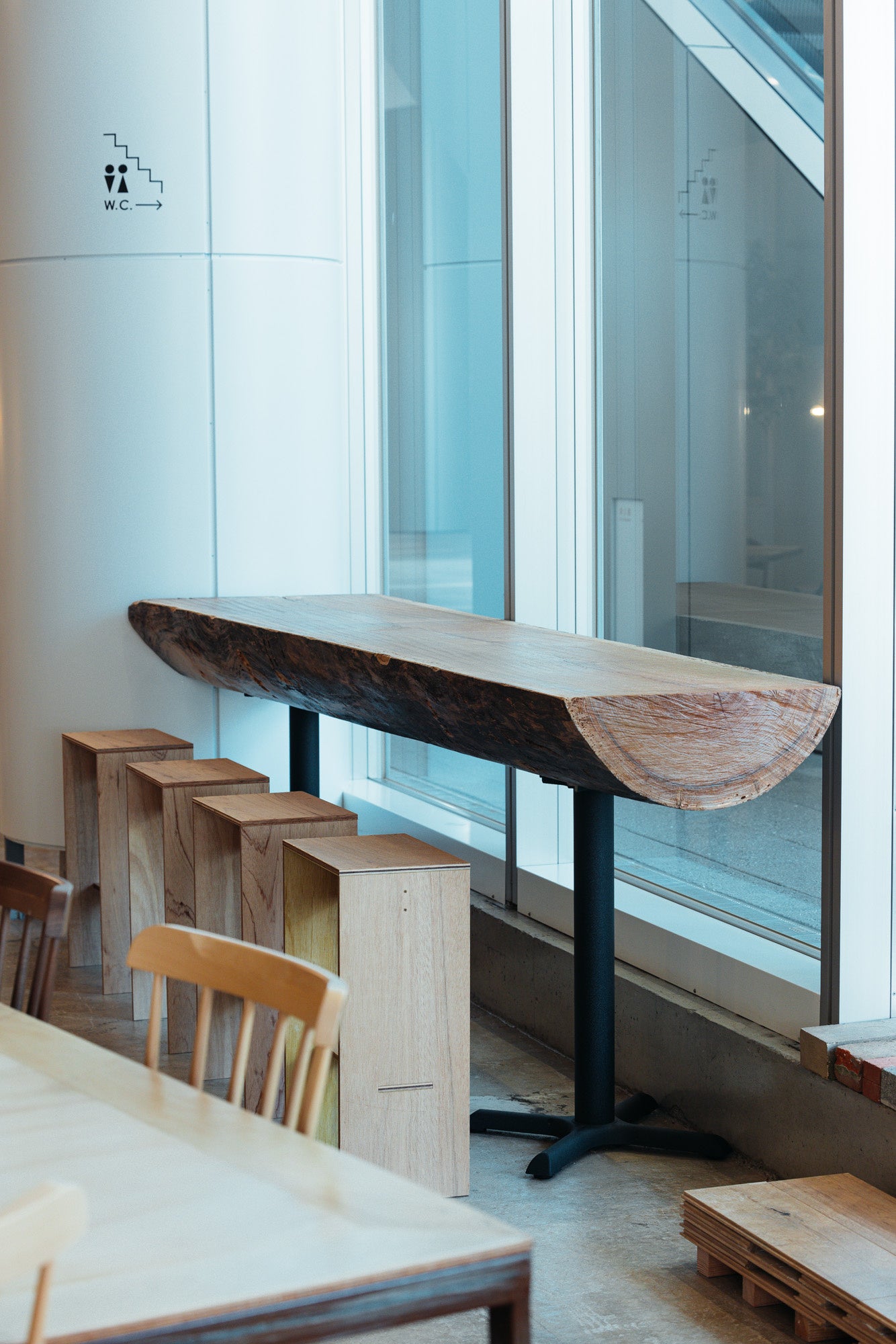 高く伸びるシェフレラの周りを囲むテーブル、またがったり、抱きかかえたくなる半割丸太のベンチやカウンター、日当たりの良いリビングのようなダウンフロアスペースなど、開放的な店内でその日の気分に合わせてお選びいただけるよう、様々な空間や家具を用意しています。多くのテーブルやベンチは、同じ一本の大きな欅の木からつくられました。機能を優先させるための形や表情に整えすぎないことで、木が本来持つ質朴な風合いを体感いただけます。また、一部の空間を間仕切りすることで、ワークショップやミーティングなどでご利用いただくことも可能です。