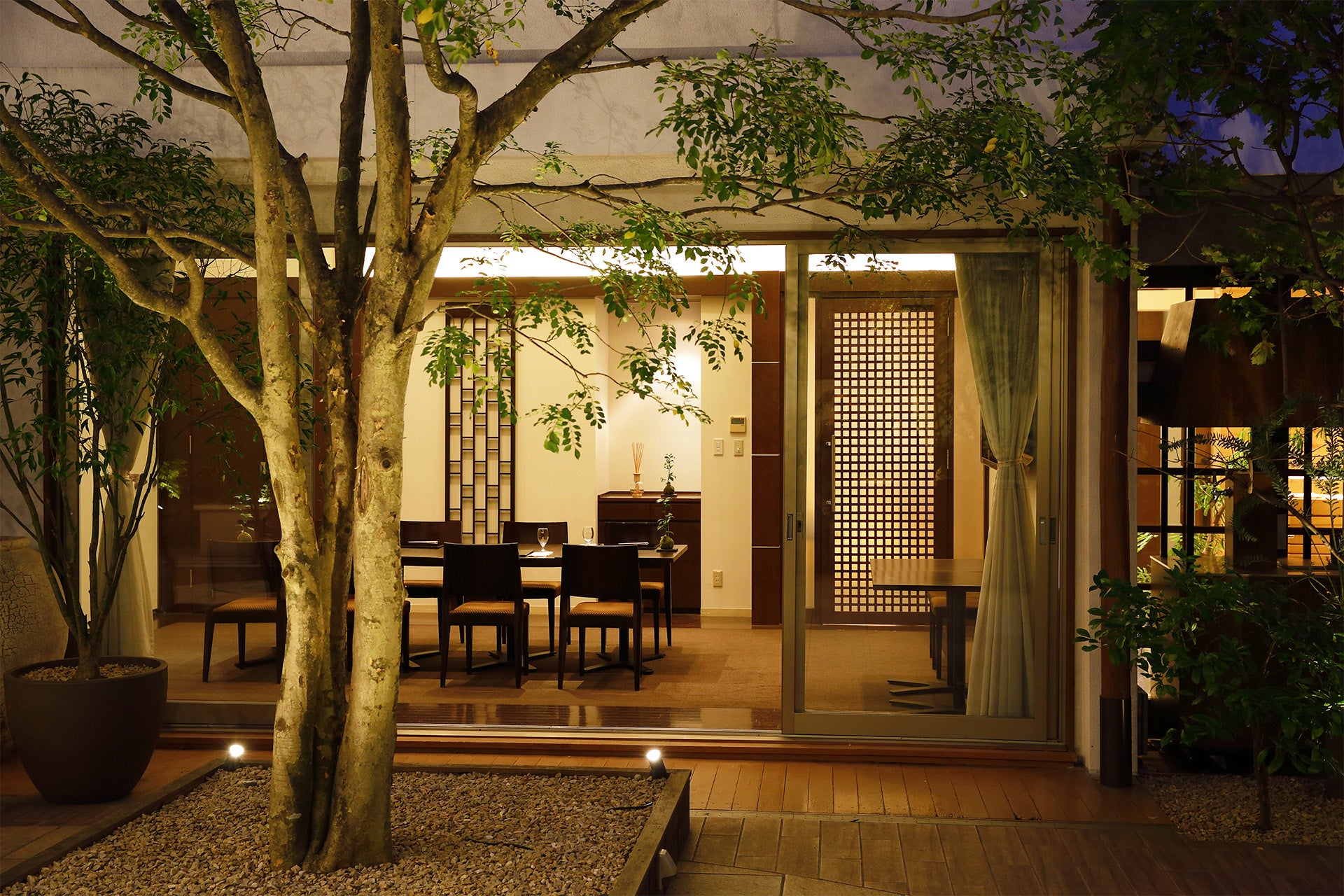 都会の喧騒を忘れる緑豊かな庭と滝の水音をBGMになる庭を眺めながら、ご家族三世代や親子で過ごす時間に最適です。お孫さまの会席デビューを祖父母と一緒にゆっくりと見守ることもできる、個室も完備しています。