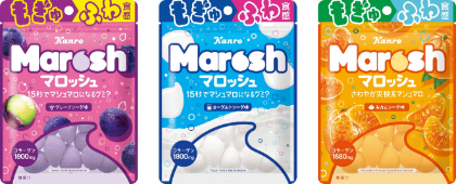 「マロッシュ」は、食べているうちにマシュマロになる不思議な食感が特徴のお菓子です。口どけの良い酸パウダーが表面にコーティングされており、口に入れるとパウダーが広がり爽快感を感じる一方で、噛むともっちりとした弾力で噛みごたえを感じられます。ぜひ、その不思議な食感をご体感ください。