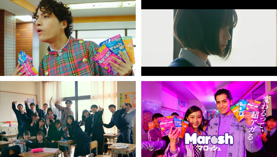 「マロッシュ」を一口頬張ると、食感の変化に合わせて2人とエキストラの高校生を含めた全員のビジュアルも変化。グレープソーダ、ヨーグルトソーダ、みかんソーダの3つのフレーバーに合わせた世界観の中でダンスするkemioさんに注目です。