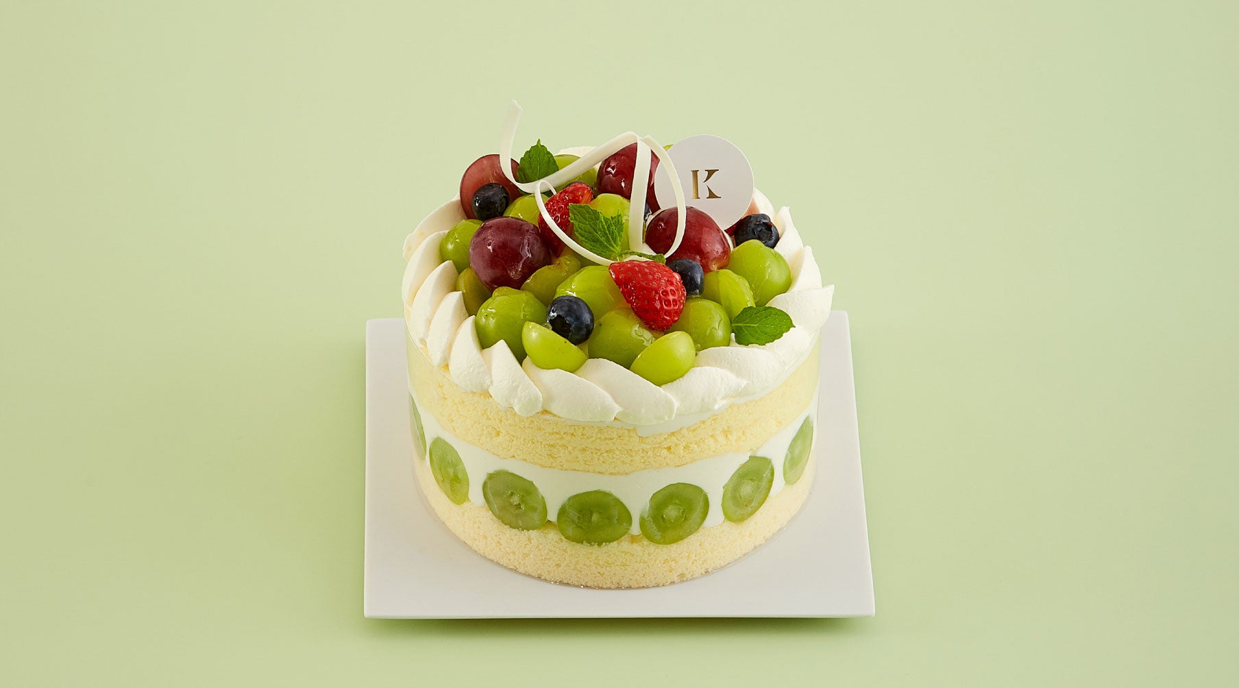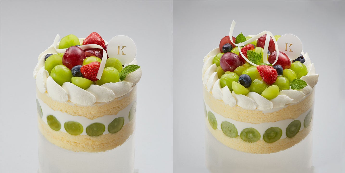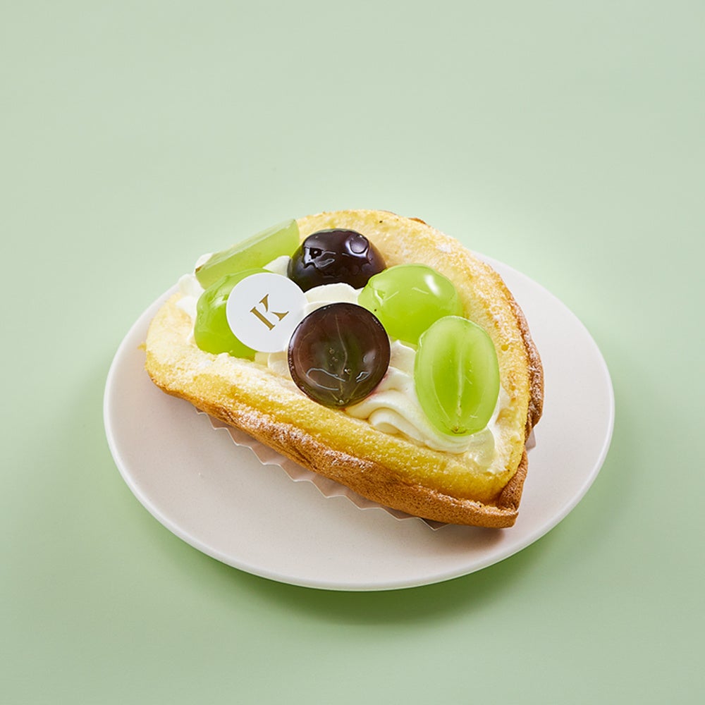 たっぷりの卵と隠し味に蜂蜜を使ったこだわりのオムレット生地に、バニラクリームを塗り、マスカットジュレ、生クリームを重ね、シャインマスカットと巨峰を飾りました。