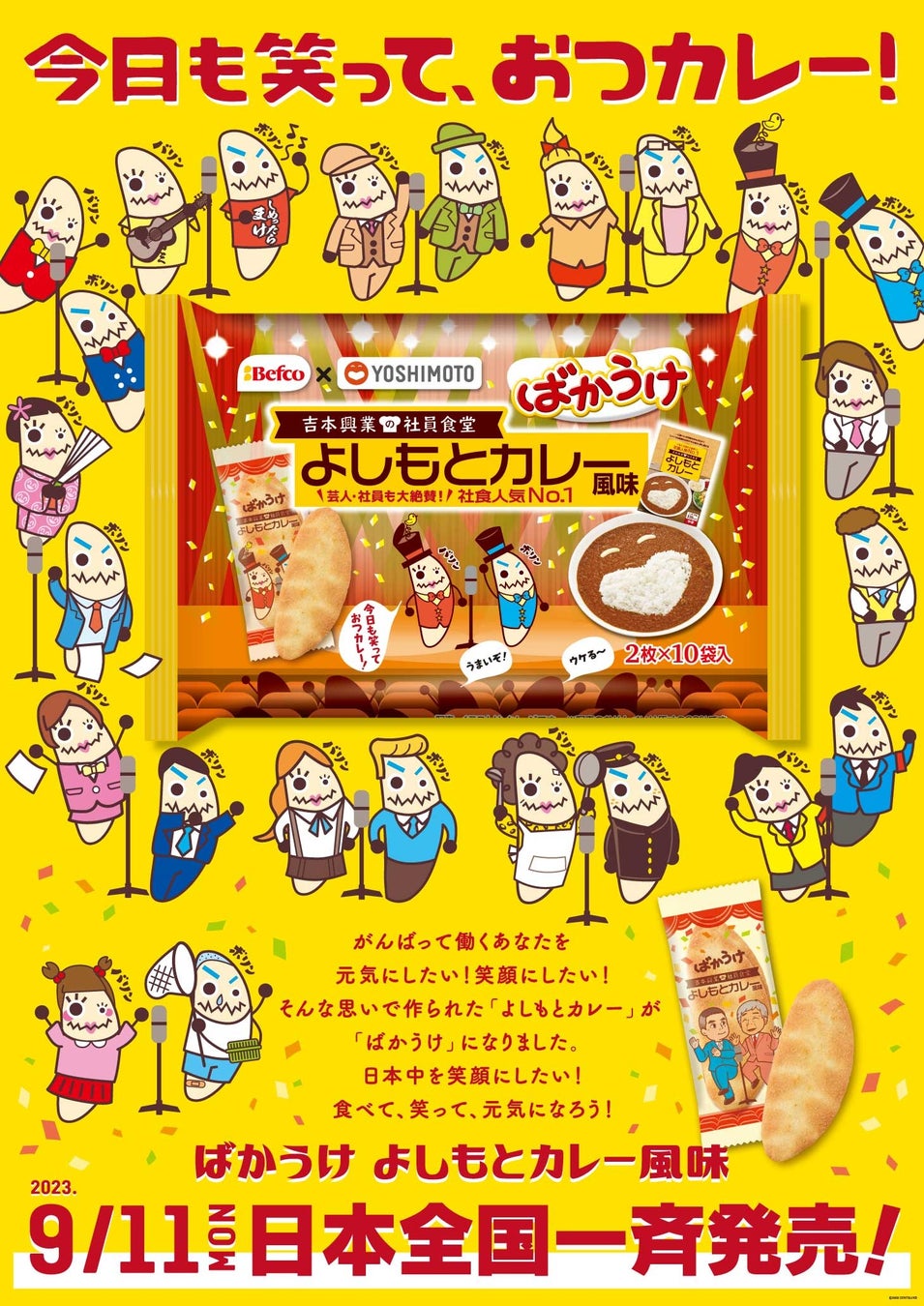 吉本興業東京本部にある社員食堂で最も人気の高いメニュー「よしもとカレー」と、新潟県の米菓メーカー、(株)栗山米菓のコラボレーション「ばかうけ よしもとカレー風味」が9月11日(月)に、全国のスーパーやドラッグストアなどで発売されます。
