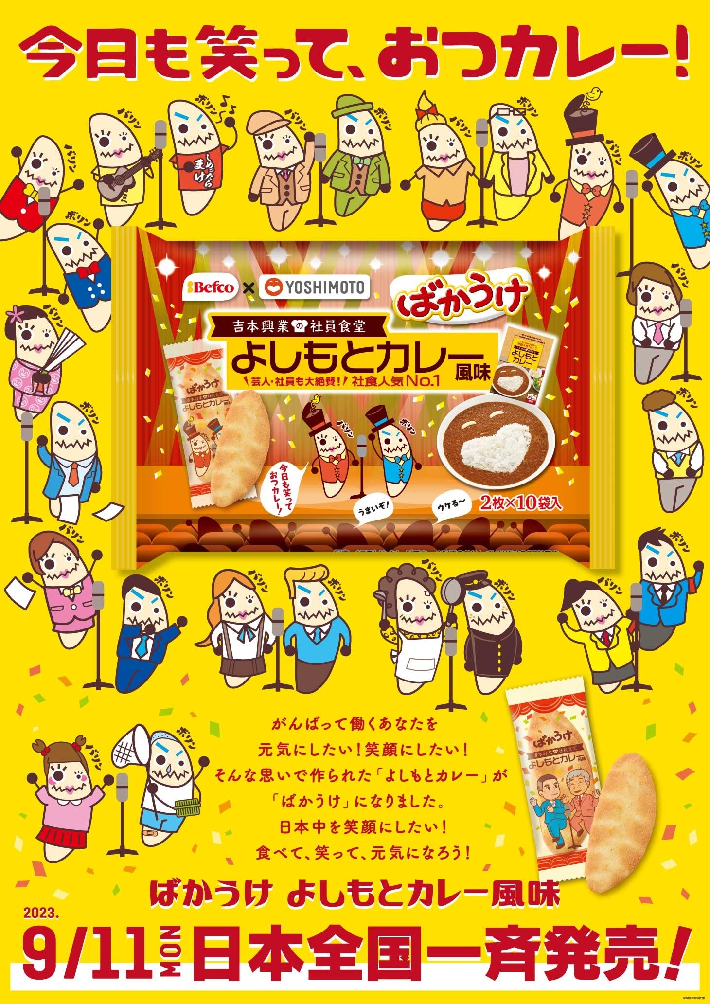 吉本興業東京本部にある社員食堂で最も人気の高いメニュー「よしもとカレー」と、新潟県の米菓メーカー、(株)栗山米菓のコラボレーション「ばかうけ よしもとカレー風味」が9月11日(月)に、全国のスーパーやドラッグストアなどで発売されます。
