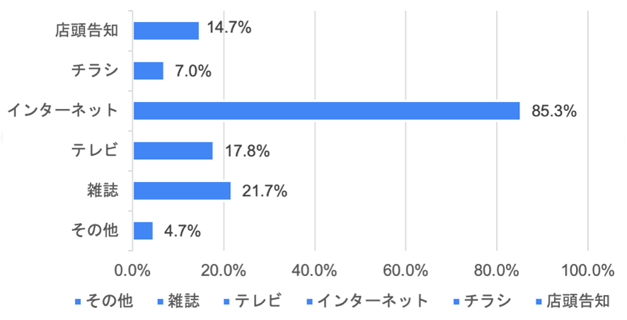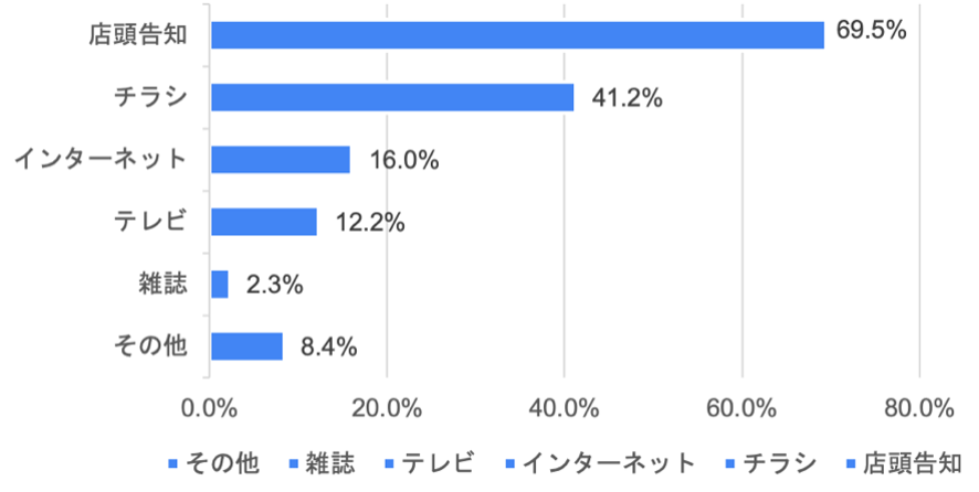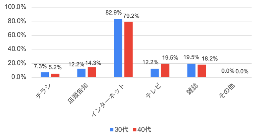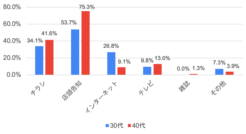 全体結果に対し、30代と40代での差異を分析すると、鶏肉を購入する時、30代は比較的、インターネットを見る傾向、40代は比較的、店頭告知を見る傾向が見られた。