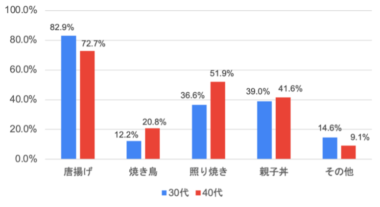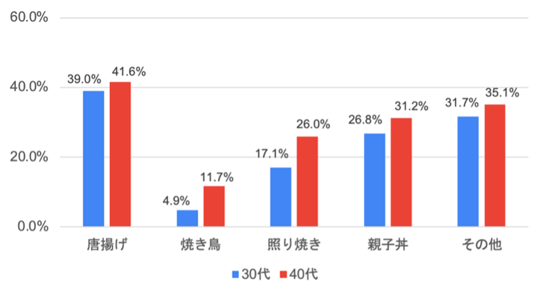 全体結果に対し、30代と40代での差異を分析すると、鶏もも肉でよく作る料理は、30代、40代とも唐揚げが最も多く差異はなく、40代では照り焼きや焼き鳥が比較的多いことが示唆された。