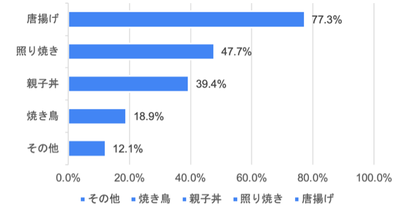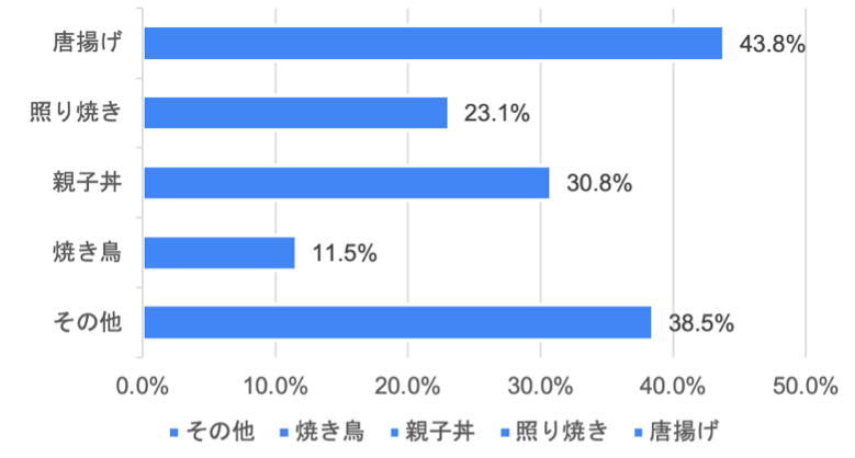 設問3と設問4における回答の傾向から、「親子丼」が鶏もも肉では3番目に、鶏むね肉では2番目に多い結果となった。