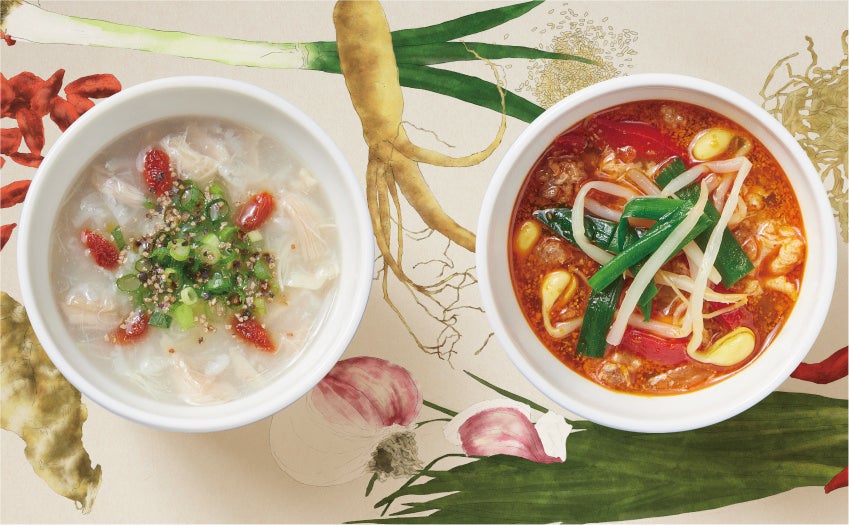 韓国の食文化には「医食同源」が根付いており、食を通して体調を管理するという考え方があります。「以熱治熱(熱をもって熱を治す)」というのもそのひとつ。暑い時期にあえて熱い料理や辛い物を食べて元気になるという考え方です。また、「五味五色」を大事にし、「青・赤・黄・白・黒」の5色からなる食材を使い5種類の味付けをした料理がバランスの取れた食事とされてきました。生姜やにんにく、高麗人参にクコの実などを使った滋養スープの「東京参鶏湯(サンゲタン)」と、程よい辛さと鮮やかな食材が食欲そそる「5色のユッケジャン」。野菜と肉、沢山の食材をバランスよく楽しむ白と赤のスープで、心も身体もととのえましょう。