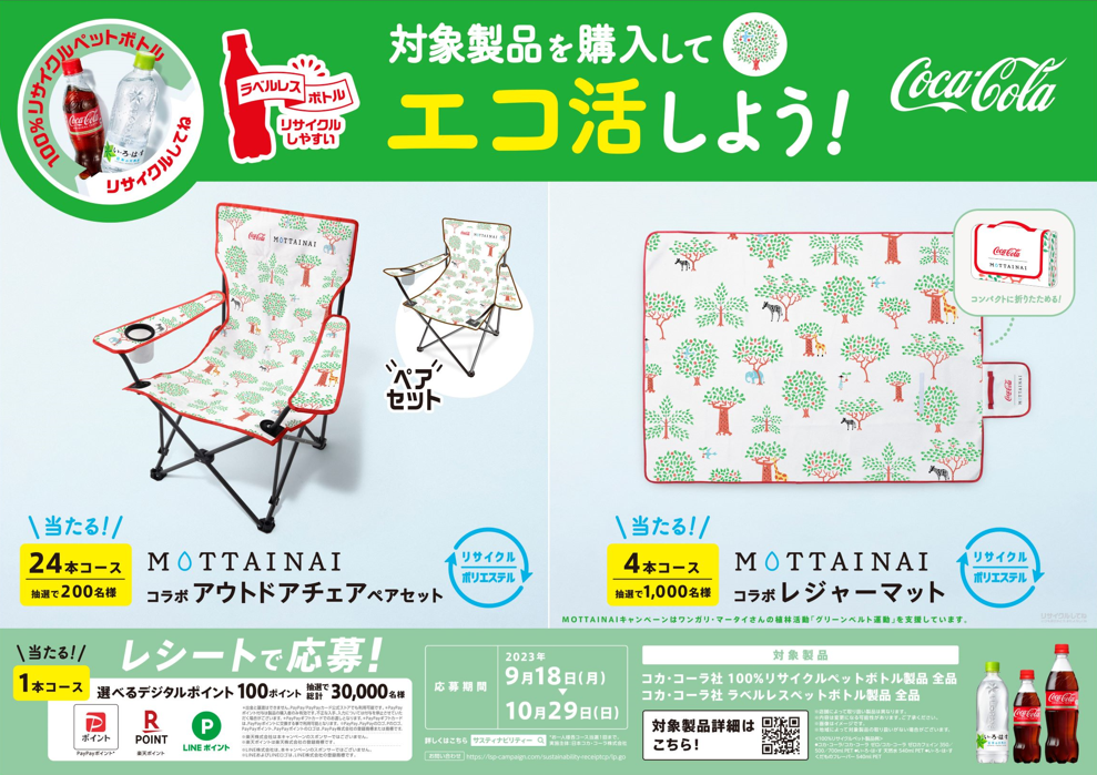 また、「コカ・コーラ」、「い・ろ・は・す 天然水」表示シール付きラベルレスボトルの発売に合わせて、全国の店舗などで「エコ活をしよう!」をテーマに、「コカ・コーラ社 サスティナビリティーキャンペーン」を実施します。100%リサイクルPETボトルの全製品および、ラベルレスPETボトルの全製品を対象に、購入本数に応じて応募すると、抽選でリサイクルポリエステル素材を使用したアウトドアチェアのペアセットやレジャーマットなどエコなアウトドアグッズ等が当たります。コカ・コーラシステムでは、このキャンペーンを通して、より多くのお客さまがサスティナブルな生活を取り入れるきっかけになっていただきたいと考えています。