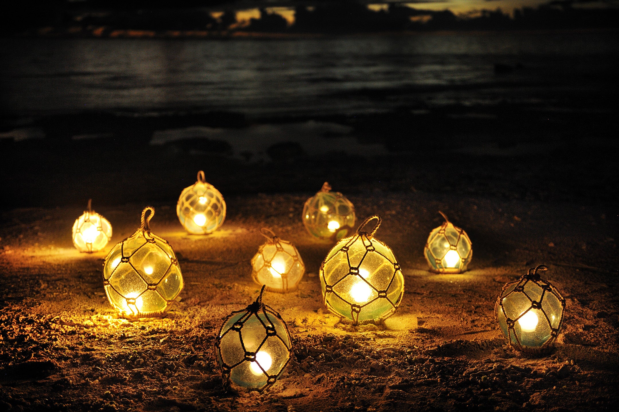資源が限られる離島の沖縄は、古くから物を大切にし資源をリサイクルする考えが息づいています。本イベントにあわせて再生ガラスを原料とした「琉球ガラス」を作るガラス工房の協力を得て、通常は廃瓶となっていたソーダの瓶を使い、オリジナルのランタンを作りました。ランタンは海の情景にあわせて漁具として使われている「浮き球」をモチーフにしています。400本以上の廃瓶をアップサイクルした大小50個の浮き球ランタンが白砂のビーチにやさしく灯ります。