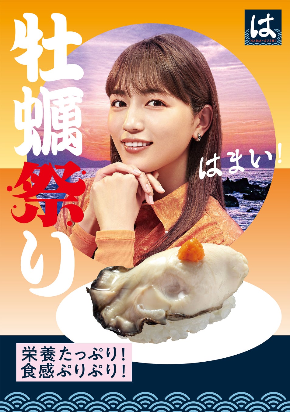 はま寿司では、9月12日(火)より、「はま寿司 牡蠣と秋の旨ねた祭り」を開催します。今回の新TVCMは、川口さんがおいしそうに商品を頬張る様子を通して、ぷりっとジューシーな「広島県産 牡蠣握り100円(税込110円)」を訴求します。