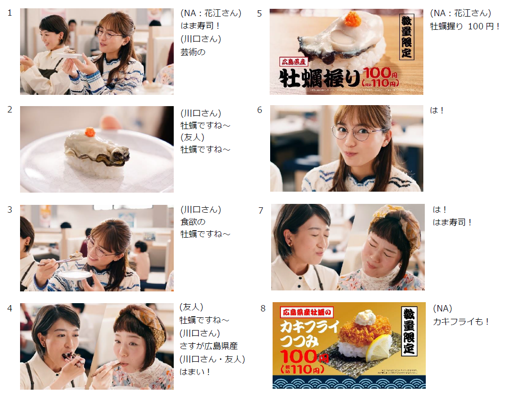とにかくお寿司が大好きで、よく高校時代の気の置けない友人とはま寿司で食事をする川口さん。提供された「広島県産 牡蠣握り」を手に取り、まじまじと見つめながら、“芸術の秋”をもじり「芸術の“牡蠣”ですね~」と一言。友人も「牡蠣ですね~」と返します。その後も、「食欲の“牡蠣”ですね~」「牡蠣ですね~」と言いながら旬の牡蠣を堪能。おなじみの掛け声「はまい!」と声を揃える3人の至福の表情にご注目ください。