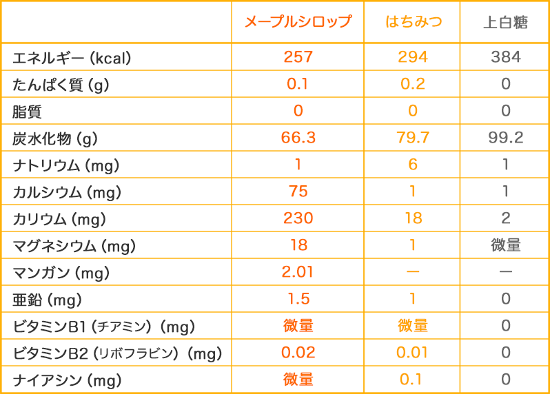 (※3)<可食部100G当たりの成分値比較表>(出典:ケベックメープルシロップ生産者協会)