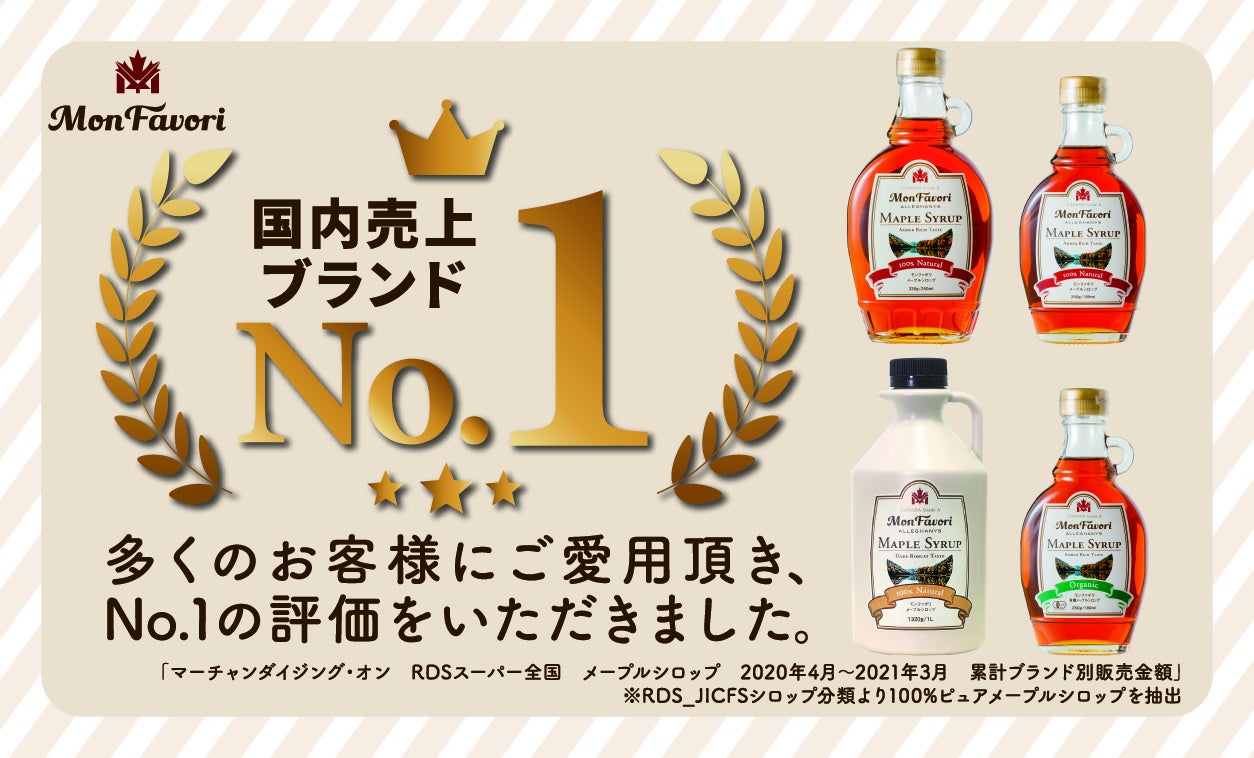 ご家庭で使用しやすいサイズ感、液だれしにくい注ぎ口など商品設計にもこだわった「Mon Favori(モンファボリ)」のメープルシロップは、販売開始以降、長きにわたり皆様にご愛顧いただいたおかげで、継続して売上を伸ばすことができ、現在では国内売上No.1ブランド(※1)となりました。さらに、最も広く使用されているグレードであるアンバーリッチテイストの『モンファボリメープルシロップ250g』は、単体で国内売上No.1を獲得いたしました。(※2)
