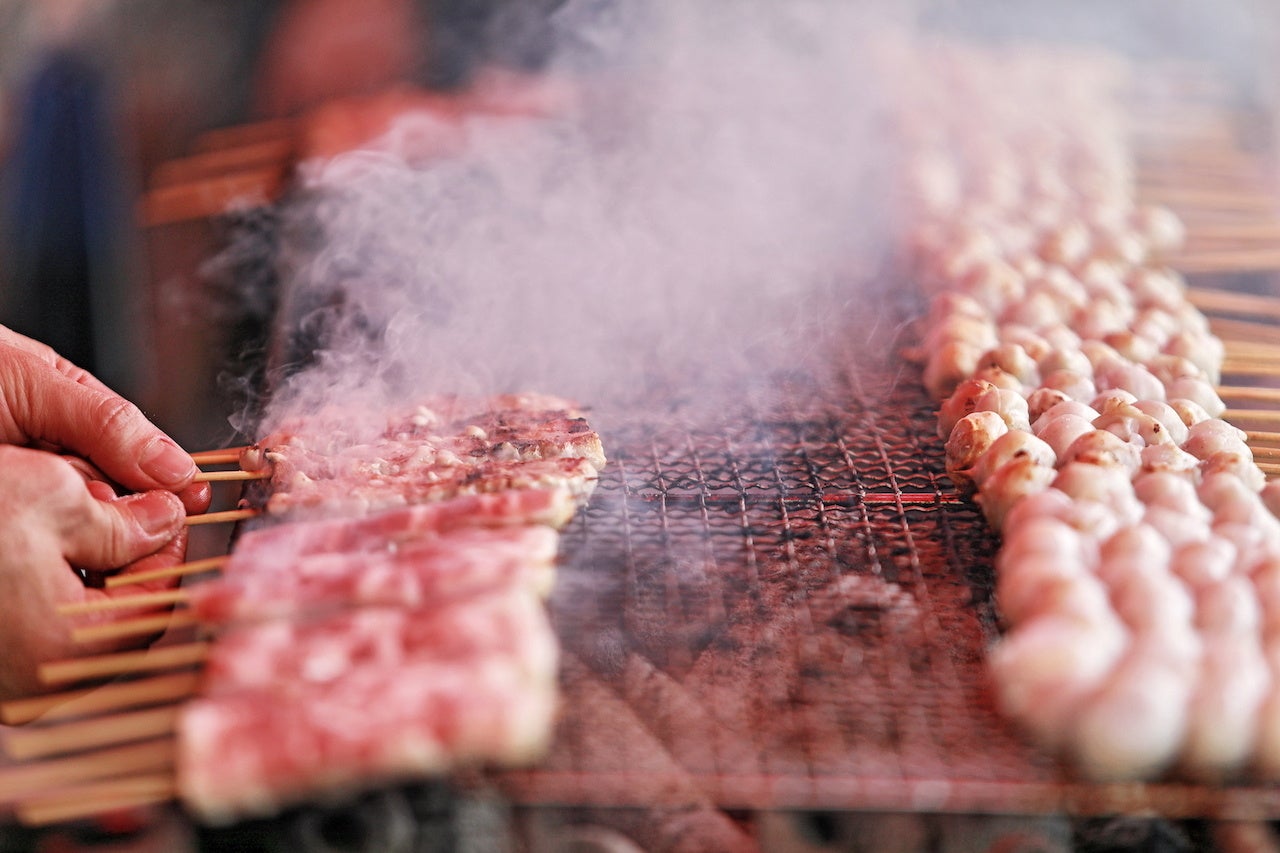 久留米焼きとりの特徴は、その品数の多さです。鶏や豚、牛、馬、魚介類、野菜、巻物などを竹串にさし、炭火でじっくりと焼きあげます。そして、焼きとりには酢ダレがかかったキャベツが添えられ、肉の間に玉ねぎが挟まれていることが多いです。