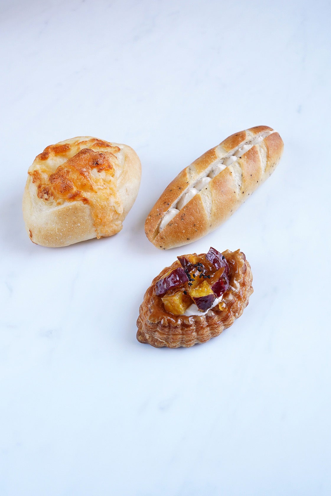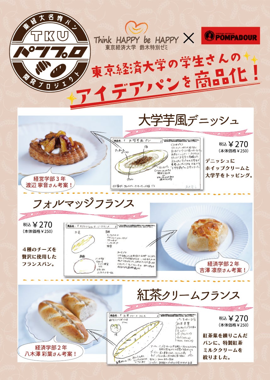開発コラボパン。パンをこよなく愛するメンバー「鈴木特別ゼミ」の学生がポンパドウル国分寺店と開発した3種類のパンを期間限定販売します。