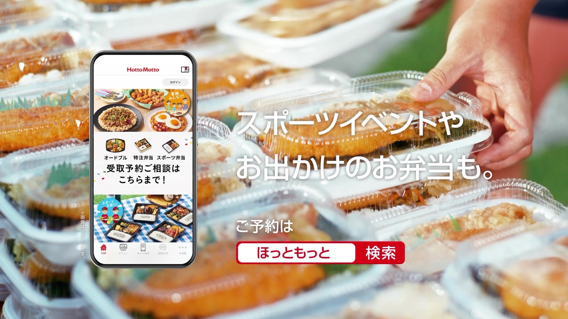 ラグビーの練習に取り組む松島選手。「のり弁、大好きです。」という松島選手や、練習を頑張る選手達に、たくさんの『のり弁当』がひとつひとつ大切に作られています。練習が終わると、差し入れの『のり弁当』に歓声が上がり、松島選手も楽しそうに練習仲間との食事を楽しみます。最後に、スポーツイベントやお出かけなどのお弁当予約を訴求することで「ほっともっと」の利用想起を狙った内容となっています。