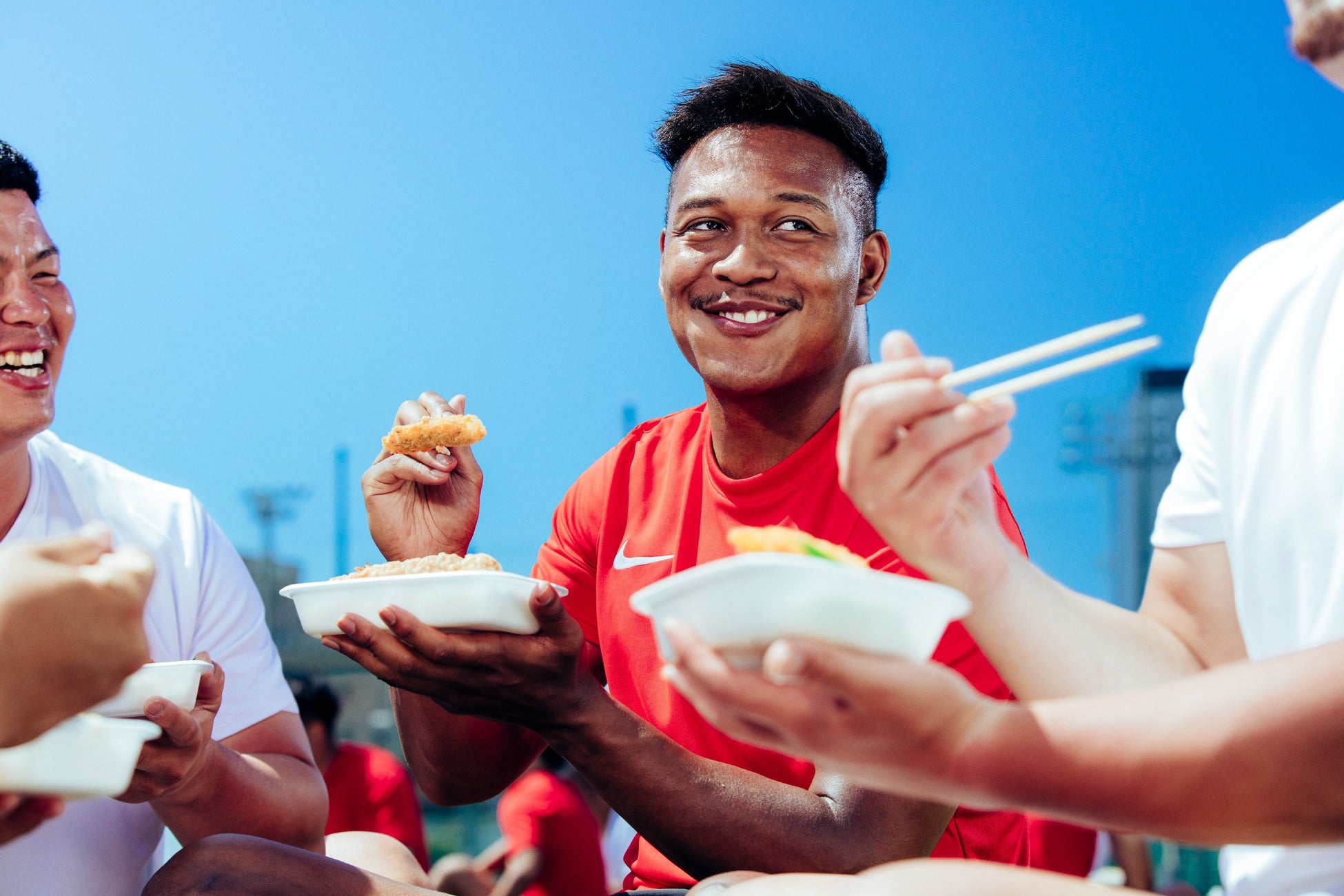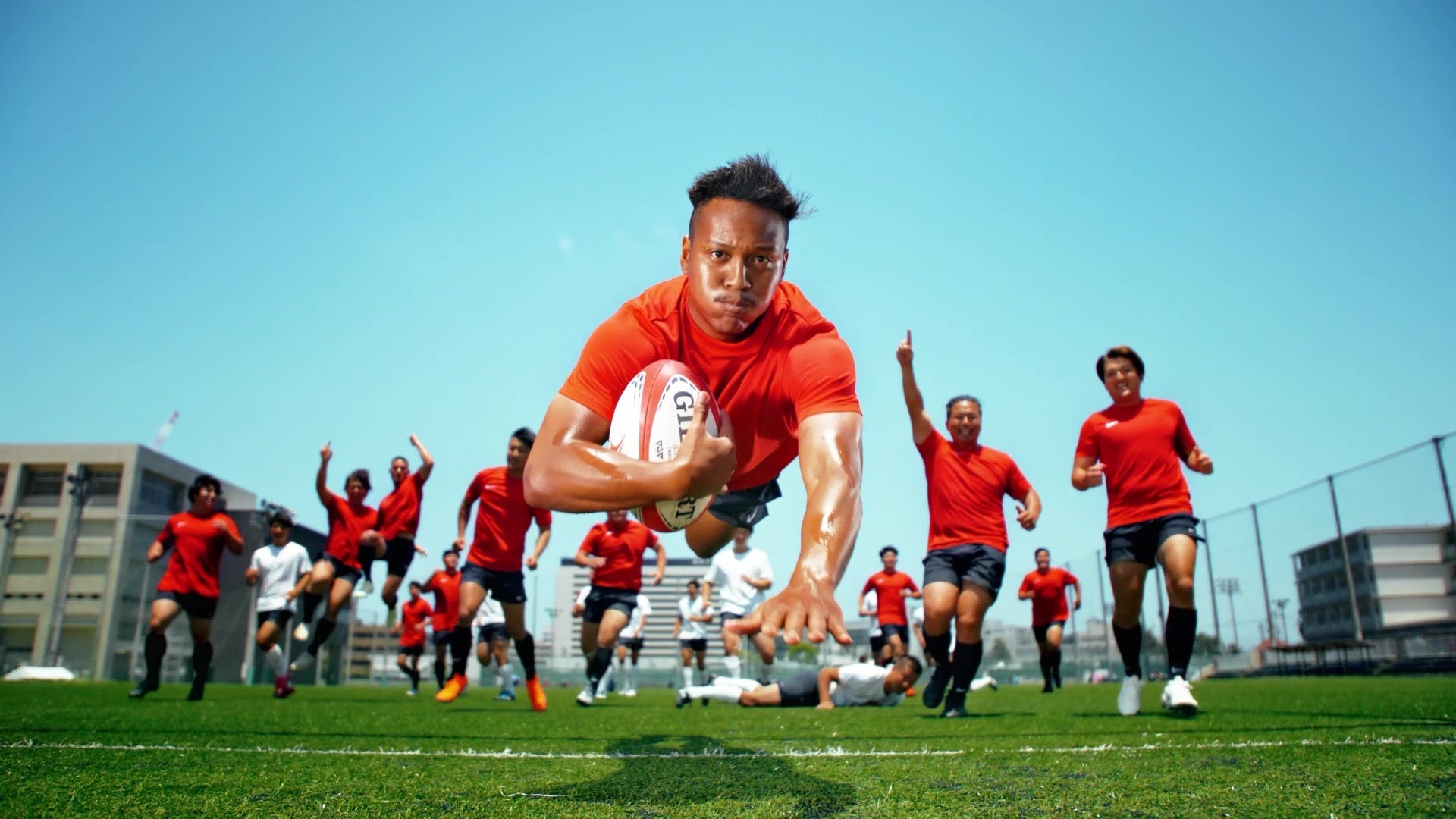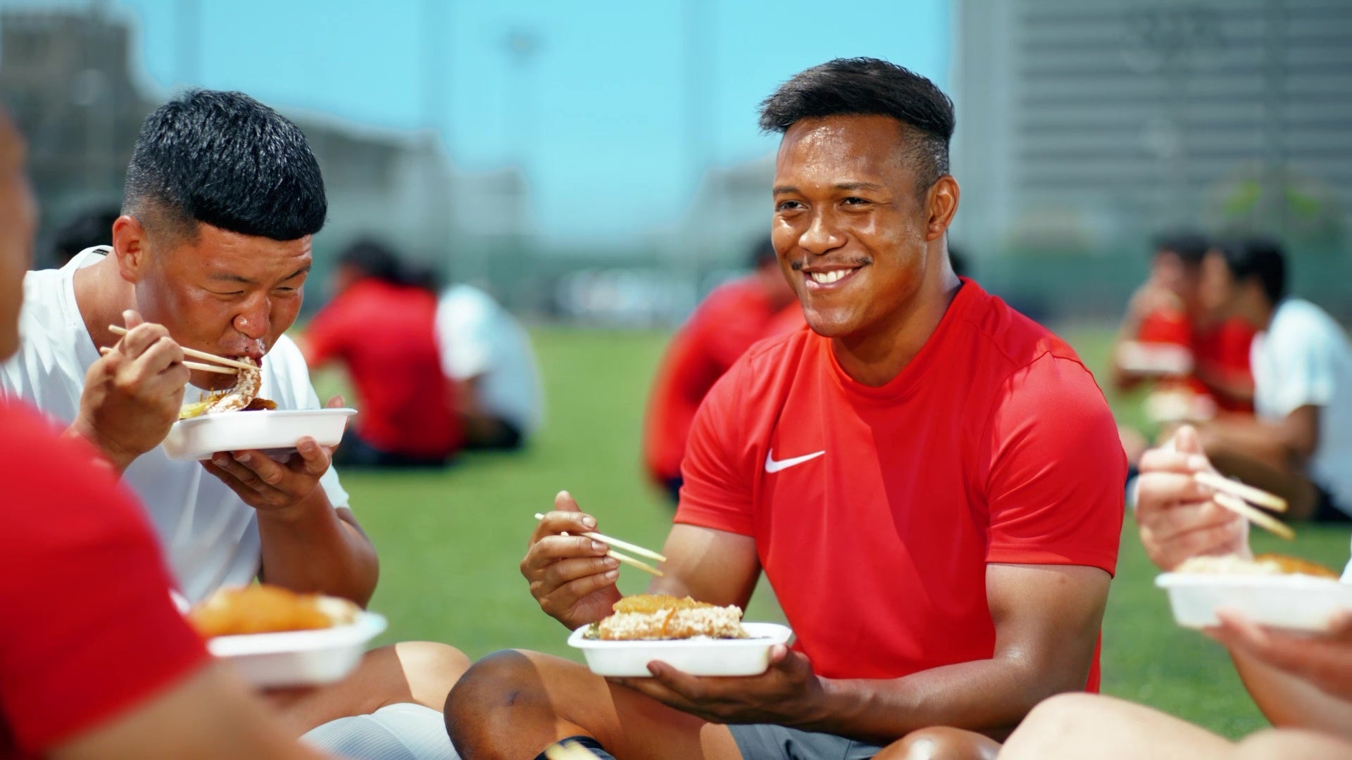 当日は天気に恵まれ、快晴の中で撮影がスタートしました。CM冒頭の松島選手がボールを受け取り駆け抜けるシーンでは、そのあまりのスピードに当初想定していたカメラの動きが追い付かないといった、トップアスリートならではのハプニングも。トライを決めるシーンは、普段見ることのできない迫力のある映像となり、チェックする松島選手も満足気でした。また、今回はラグビーの練習風景がメインということもあり、食事シーンの撮影で『のり弁当』が到着すると、お腹を空かせた選手達から歓声が上がり、松島選手も楽しそうに食事をされていました。