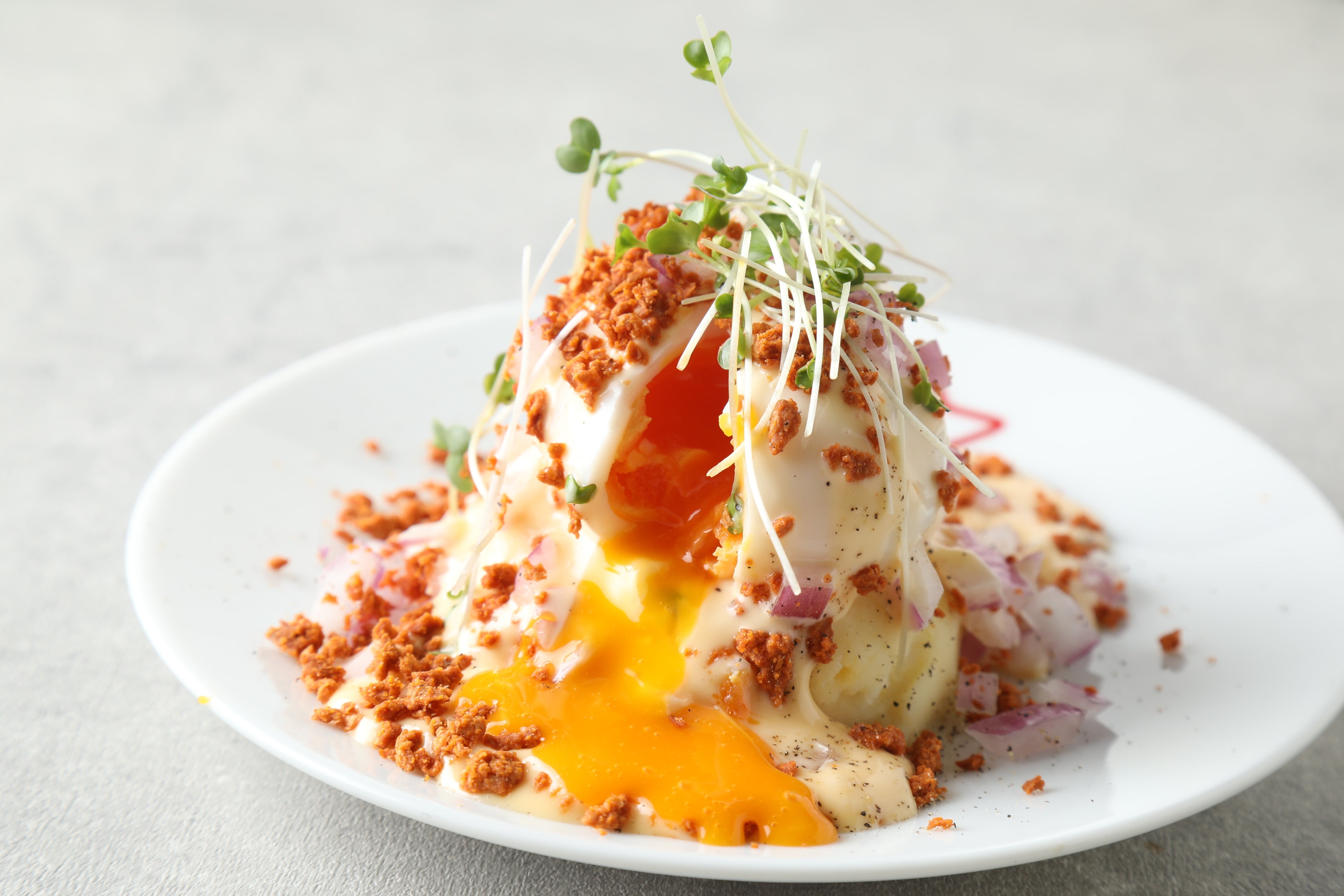 ニンニクと米酢とからしを効かせた手作りマヨネーズにマッシュポテトとまるごと半熟卵を混ぜながら食べる