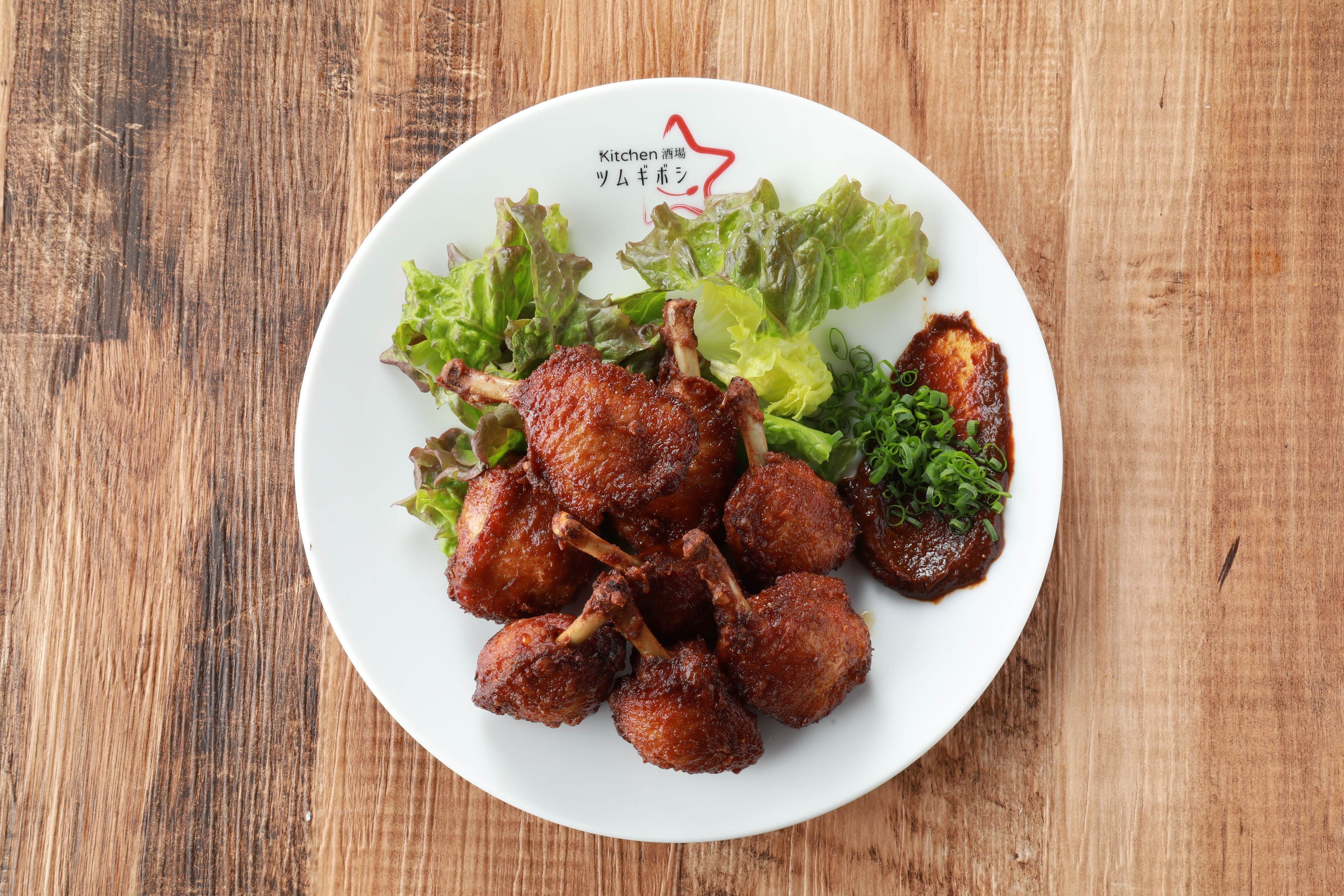 鶏の手羽先を1本1本骨を抜きチューリップの形に成形した唐揚げ。八丁味噌とニンニク、生姜を効かせてカリッとジューシーに揚げます。1本150円(税込み165円)一人呑みの方も多いので1本から注文できるようにしています。