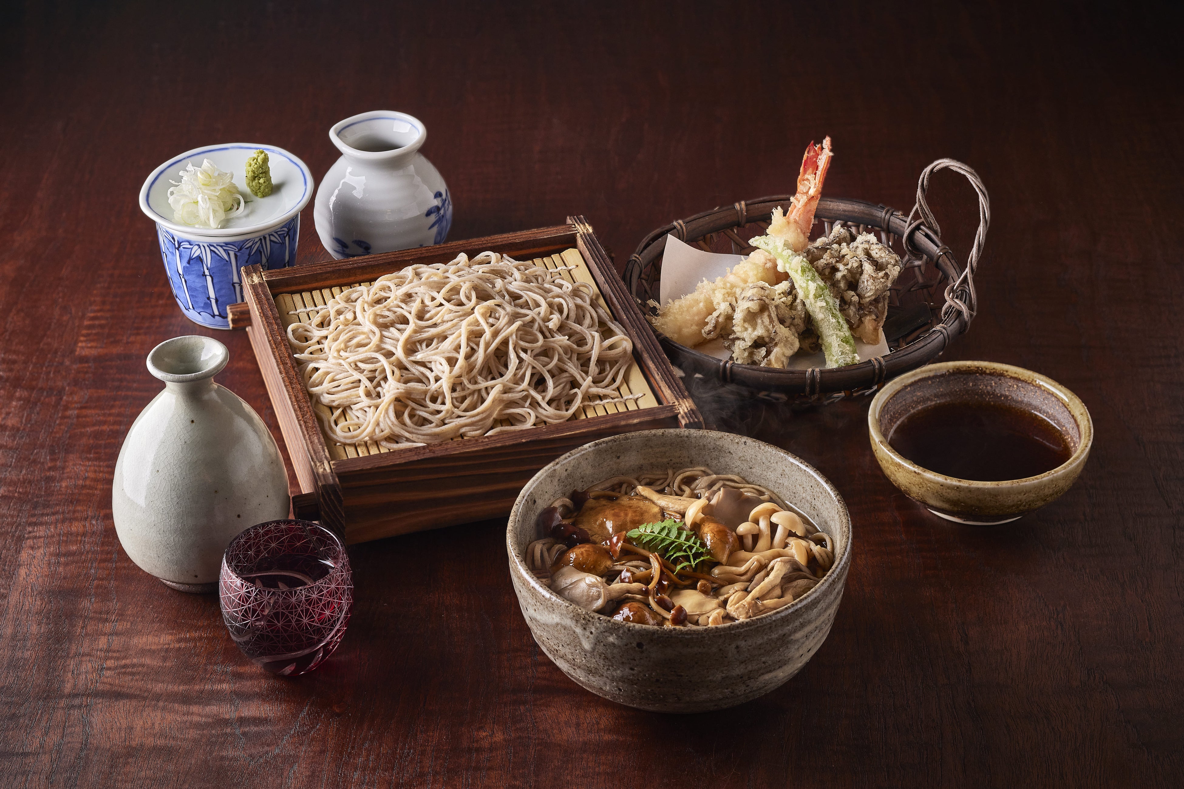 さっくりと揚がった希少な黒舞茸は肉厚でうまみたっぷりの贅沢な味わい。温かい蕎麦には6種類のキノコがたっぷり入っており、美食の秋を存分に堪能できるひと品です。