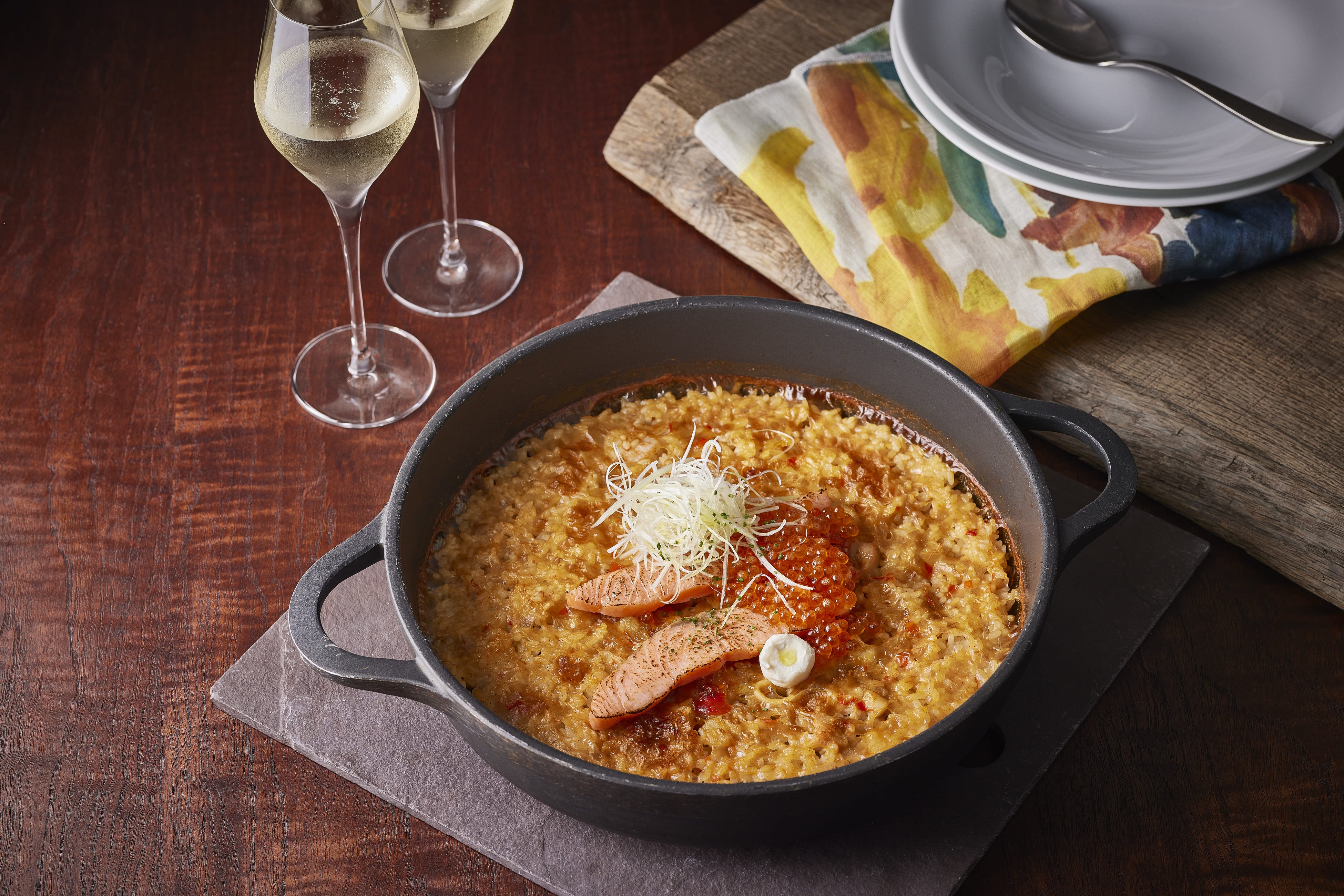 毎年人気の秋のパエリア。今年は表面を軽くあぶったサーモンとたっぷりのイクラが乗った艶やかな逸品に仕上げました。日本の食材とスペイン料理の見事な融合は味わう価値あり。
