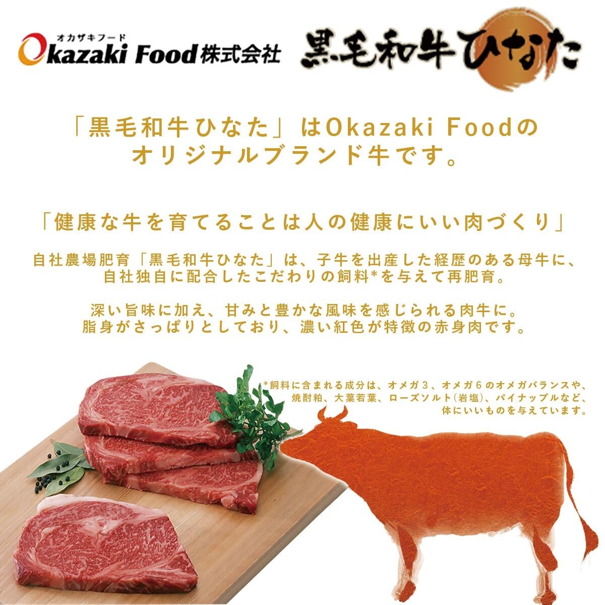 Okazaki Foodのオリジナルブランド牛で、自社農場で肥育されています。出産経験のある母牛には自社独自の完全配合飼料が与えられ、肉本来の深い旨みを感じられるよう再肥育されました。