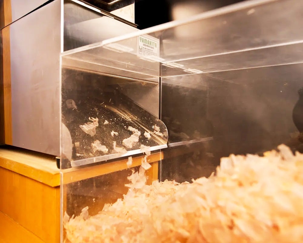 こだわり抜いて選んだ本枯節を、極薄の0.01mmの薄さで店舗で削り出しています。お店でしか味わえない削りたての香りと、極薄で口の中で溶ける食感を存分にお楽しみください。