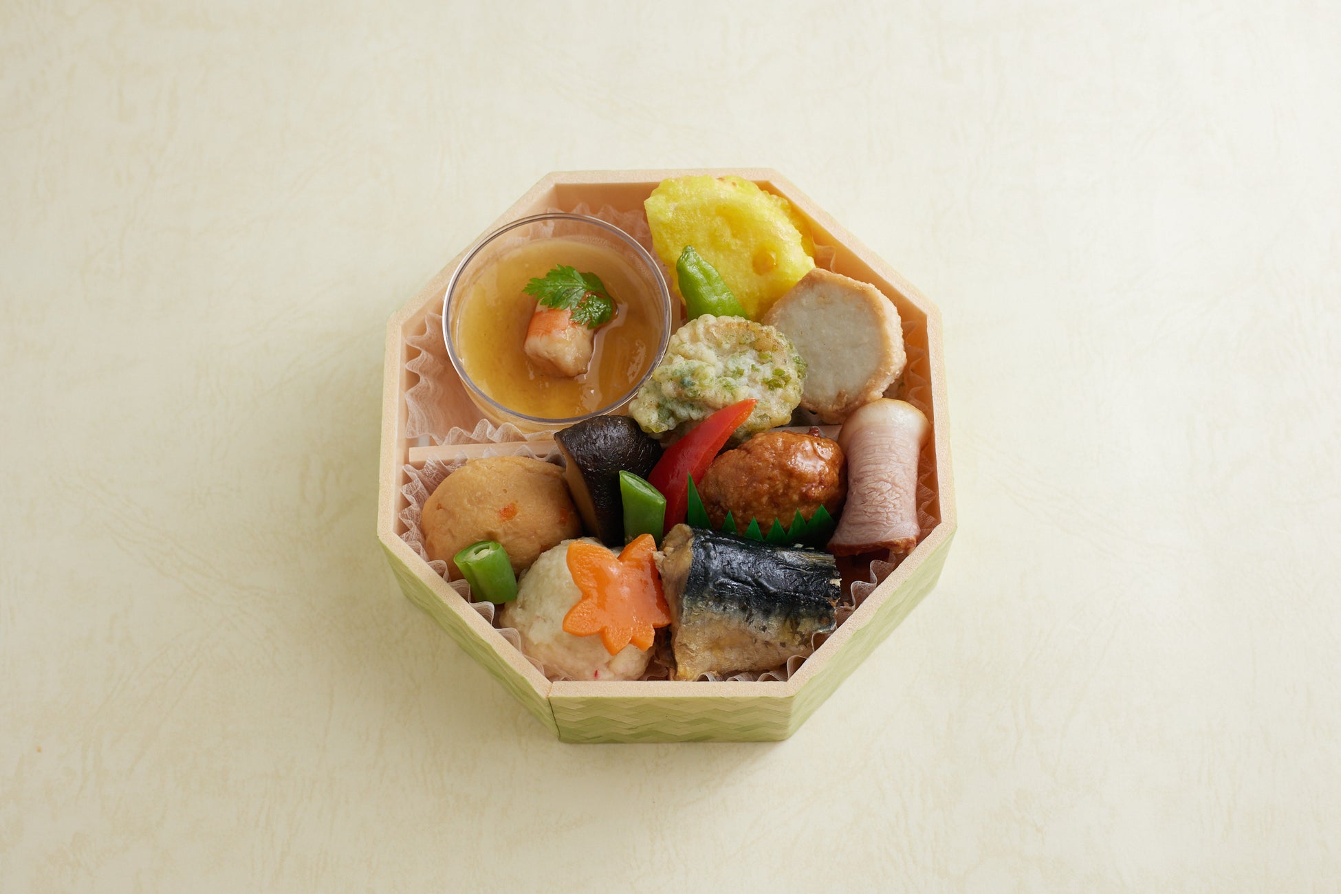 UMAMIEGGを使用した豆乳豆腐を入れたなだ万厨房のおかずの折り詰め。人気定番の惣菜とともにお楽しみください。