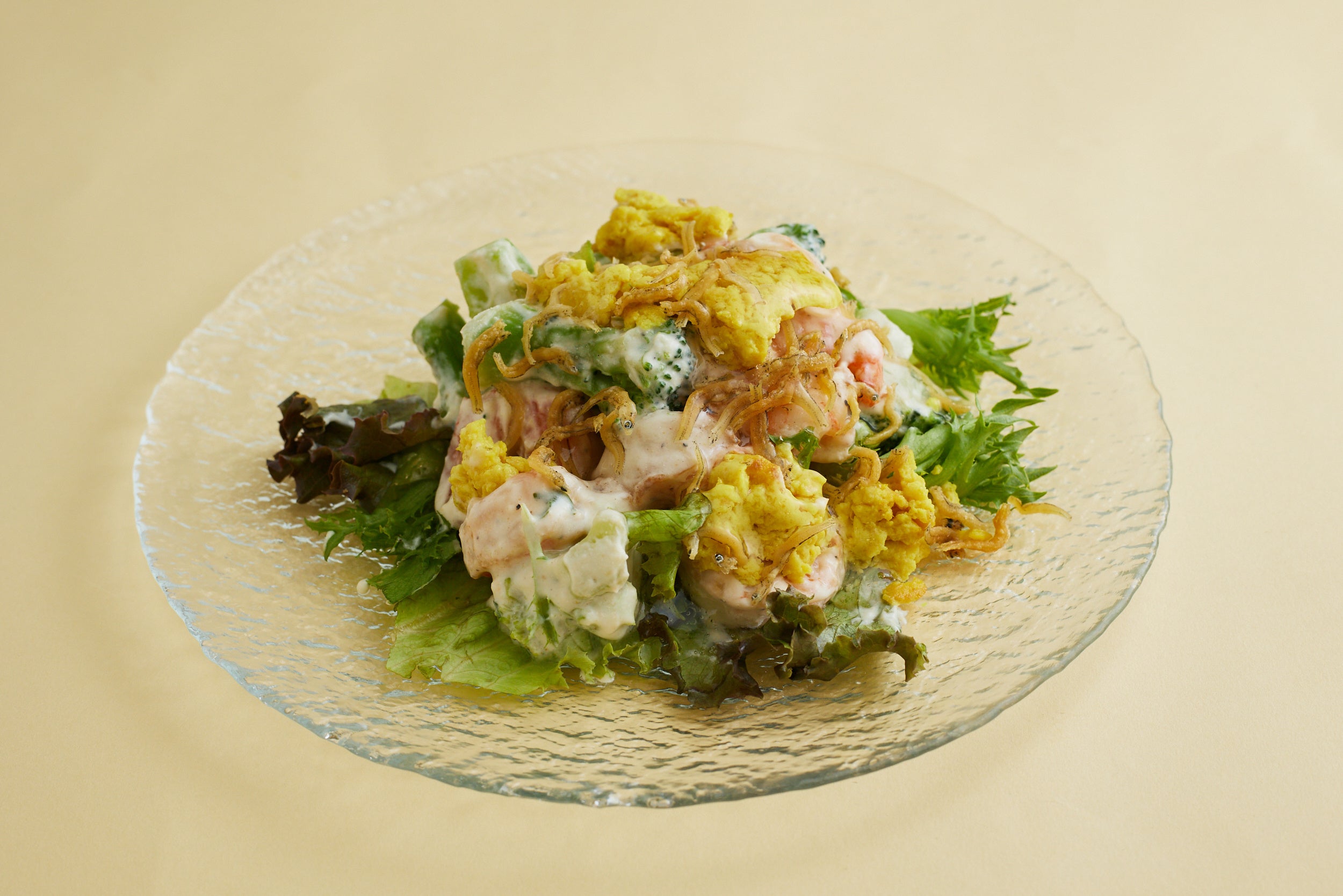 海老にカリカリとした揚げじゃこ、まろやかなクリーミーソースを組み合わせたサラダ。焼いて旨味を引き出した海老に、ソースにはUMAMIEGGを使用しクリーミーな味わいに仕上げました。ふわふわ食感のUMAMIEGGや、揚げじゃこの旨みと食感がアクセントです。