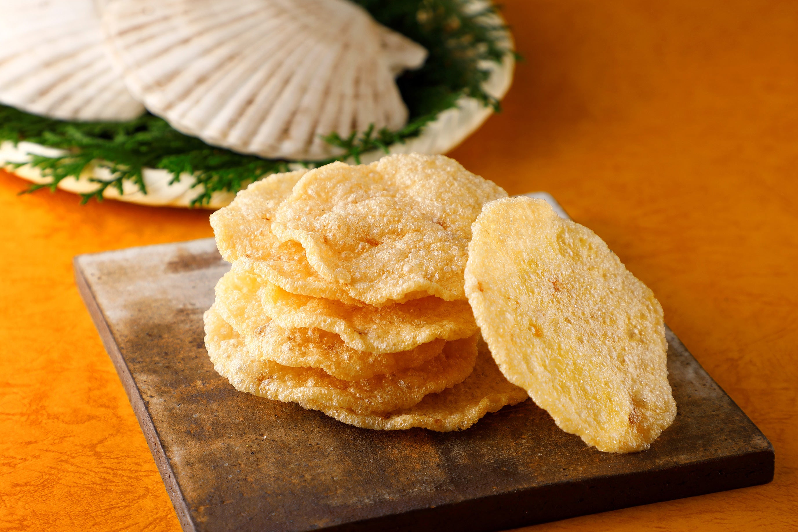 北海道で水揚げされ、ぎゅっと旨味を閉じ込めた帆立を、すけとう鱈や太刀魚などの厳選した魚のすり身と合わせ、国産の米粉と一緒に練りこんだサクサク食感のおせんべいです。