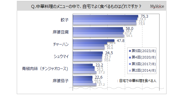 自宅で中華料理を食べる人に、よく食べるメニューを聞いたところ(複数回答)、「餃子」が75.3%、「麻婆豆腐」が58.0%、「チャーハン」が47.8%、「シュウマイ」が34.5%です。好きな中華メニュー同様、「チャーハン」が2020年調査より増加しています。