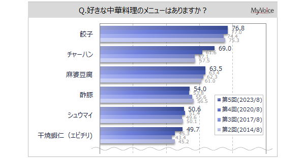 好きな中華料理のメニューは(複数回答)、「餃子」が76.8%、「チャーハン」「麻婆豆腐」が各60%台、「酢豚」「シュウマイ」が各5割強です。2020年調査と比べて、「チャーハン」が増加しています。