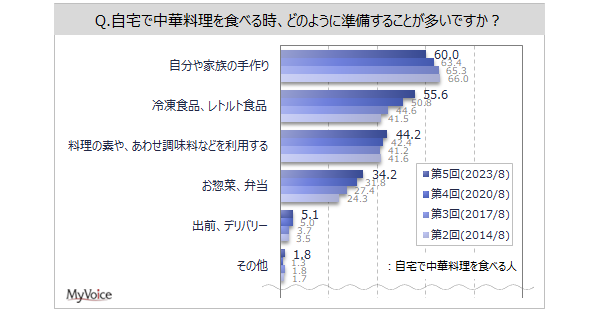 自宅で中華料理を食べる人の準備方法は(複数回答)、「自分や家族の手作り」が60.0%、「冷凍食品、レトルト食品」が55.6%、「料理の素や、あわせ調味料などを利用する」が44.2%、「お惣菜、弁当」が34.2%となっています。過去調査と比べて、「冷凍食品、レトルト食品」「お惣菜、弁当」は増加傾向、「自分や家族の手作り」は減少傾向です。