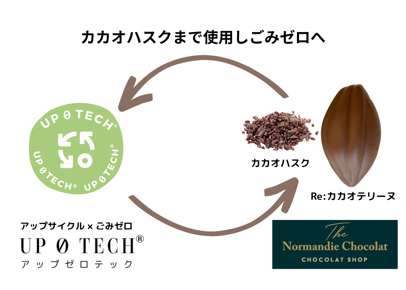 子の部分だけで実にカカオの実の5~10%に過ぎず、残りの90~95%が残滓として廃棄されています。(日本チョコレート・ココア協会のデータを一部抜粋)その上、そのカカオ豆の外側の殻(カカオハスク)はチョコレート原料として利用価値が低く、これまで廃棄されて来ました。SDGsが叫ばれている中でカカオハスクも有効活用するべきという問題意識を持たれているNormandie Chocolatではアップサイクルしてごみゼロにする「UP0TECH®」に関心を寄せられていて、カカオハスクの有効利用をすることのご相談を受けました。そしてこの度、カカオハスクまでをもチョコレート原料にする、カカオ豆まるごと使用した今回の商品がソーイとNormandie Chocolatとの協業によって誕生しました。