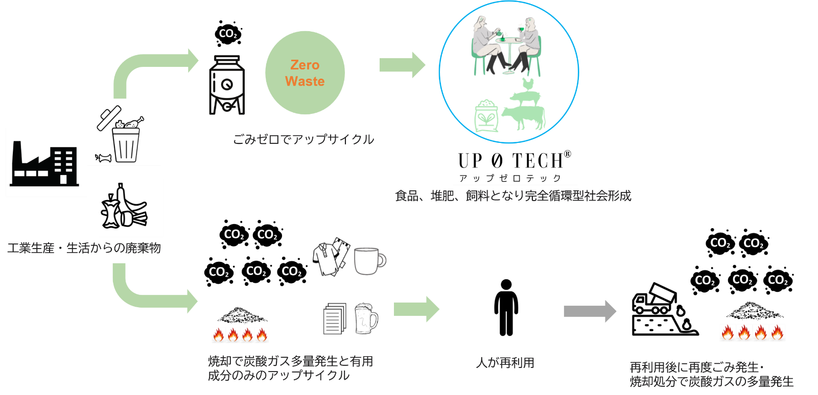 「UP 0 TECH ®」は、「もったいないをかたちに」をいかに実現するかという事から始まった考え方です。今まで廃棄されていた食品残滓を再利用し、我々が食べたり飲んだりすることで、100%ごみゼロとなり、同時に循環が完成します。