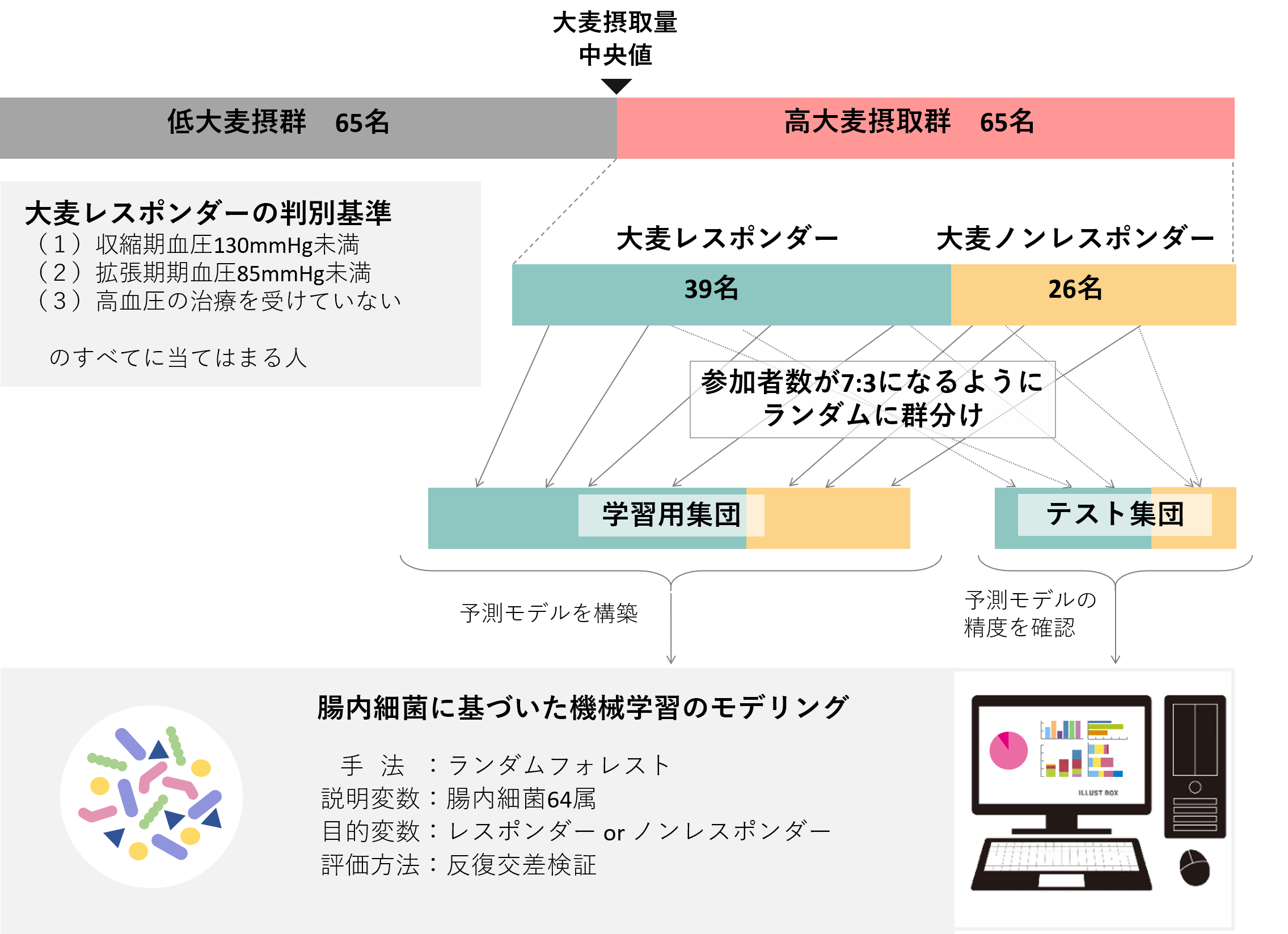 そこで我々は、脂質異常症だけでなく、高血圧に対する大麦摂取の影響の個体差にも、腸内細菌叢の違いが関与する可能性があると考えました。