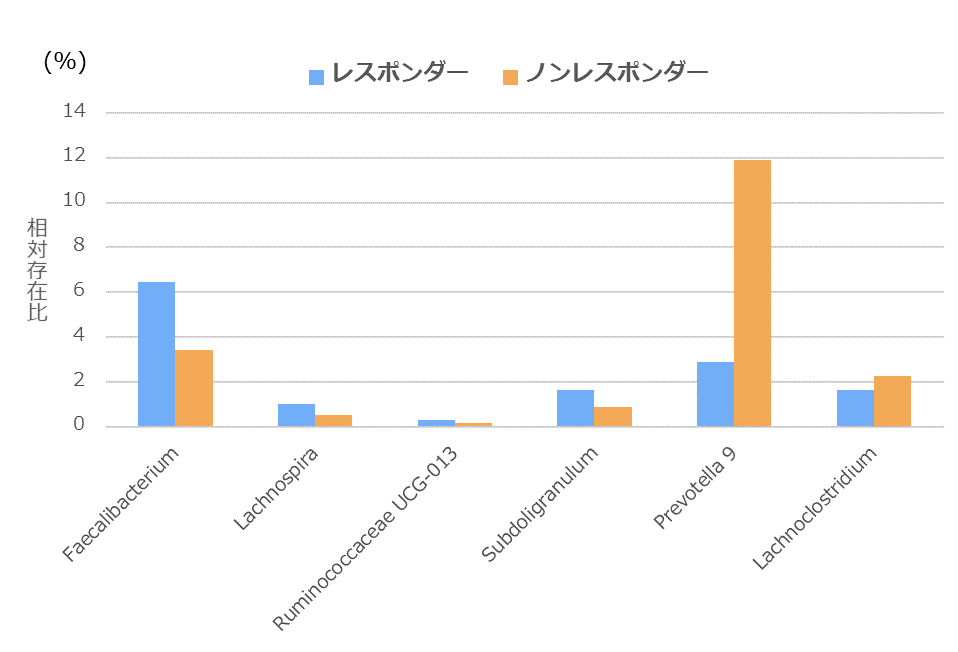 腸内細菌の平均相対存在比が高い上位50属の存在量を比較したところ、レスポンダーの糞便ではノンレスポンダーよりもFaecalibacterium、Lachnospira、Ruminococcaceae UCG-013、Subdoligranulumが有意に高く、Prevotella 9とLachnoclostridiumが有意に低いことが明らかになりました。
