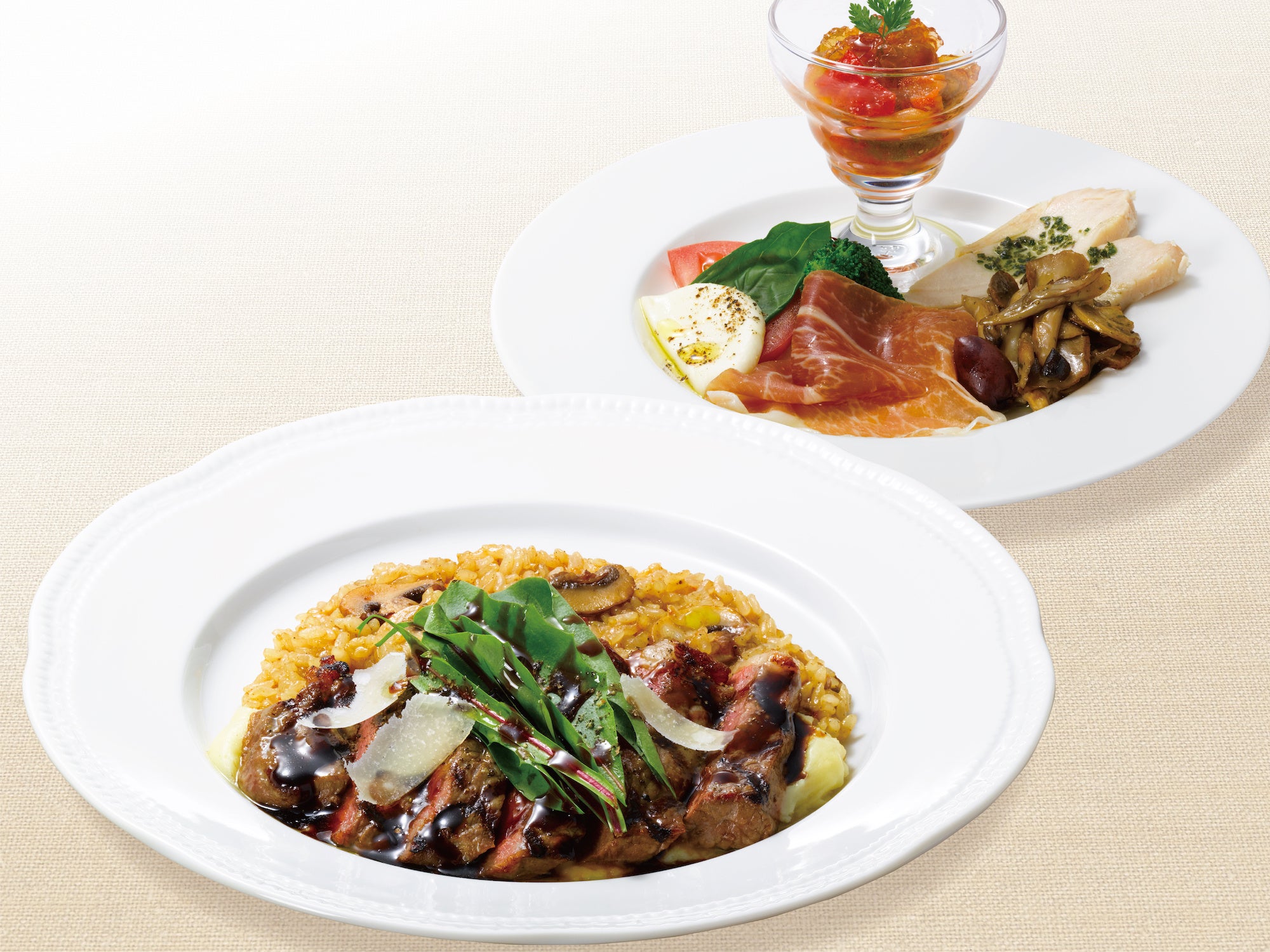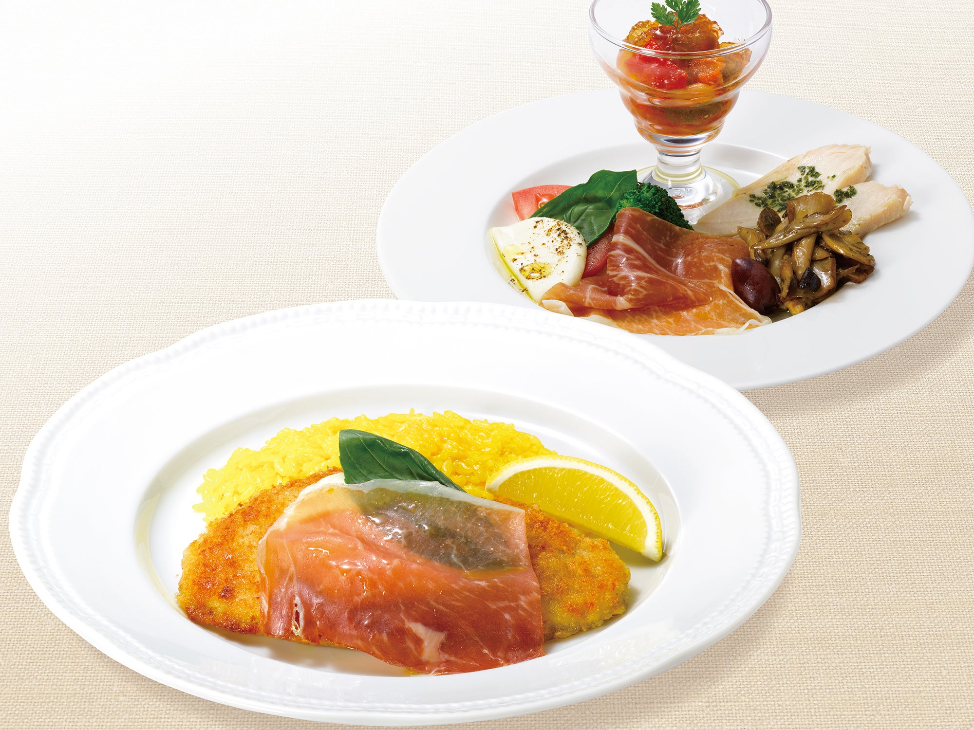 前菜とメイン料理の計2皿で楽しむ「イタリアンピアット」は、前菜に「アンティパストミスト(前菜盛り合わせ)」、メイン料理はミラノで有名なカツレツをアレンジした「ミラノ風イタリアンピアット(ポークカツレツ~サフランリゾット添え~)」または、牛肉にバルサミコソースを添えた「フィレンツェ風イタリアンピアット(牛肉のタリアータ~ポルチーニリゾット添え)」からお好みでお選びいただけます。