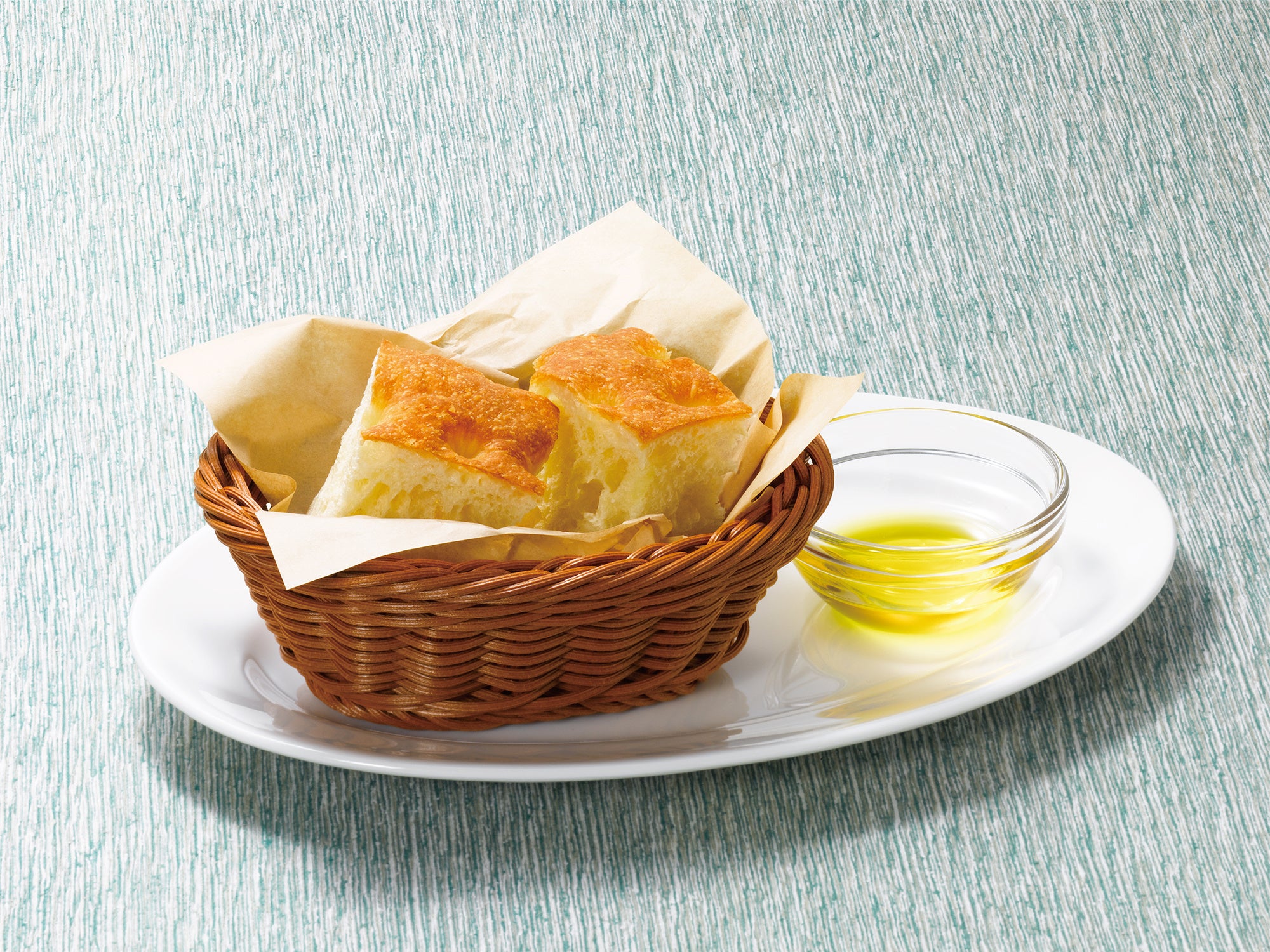 ピザの原型と言われる素朴なパン、フォカッチャ。オリーブオイルをつけるとより一層美味しくお召し上がりいただけます。