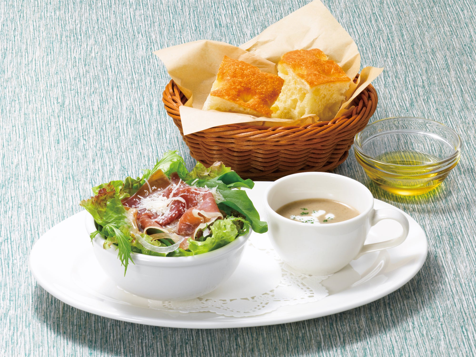 季節のマッシュルームスープ、生ハムサラダ、フォカッチャのセット。主菜と共に小さなサイズで生ハムサラダとスープがお楽しみいただけます。