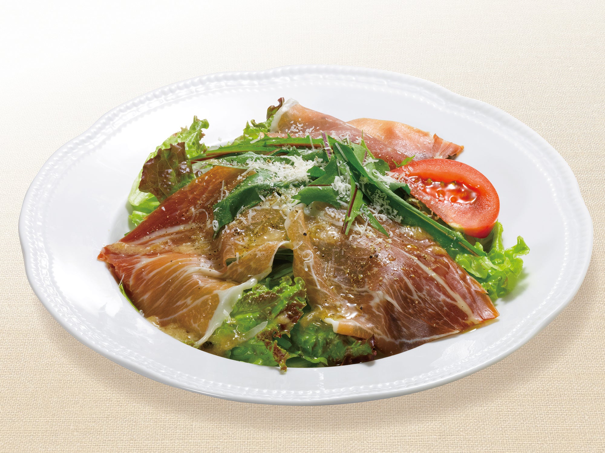 生ハムやイタリアンレッドにサニーレタス、トマトやレッドオニオンなど数種類の野菜に、北イタリアで生産されたパルミジャーノレッジャーノチーズをかけて仕上げました。ワインなどお酒が進む一皿です。