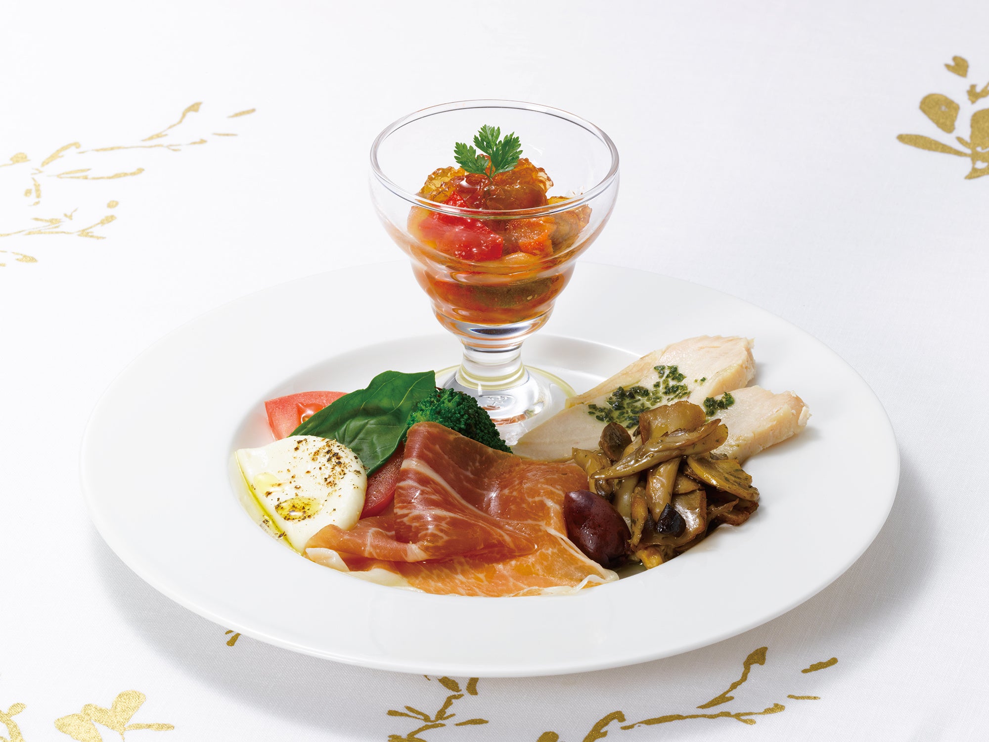 南イタリアで有名な「カポナータ(野菜のトマト煮込み)」にコンソメジュレを合わせグラスに盛り、トマトとモッツァレラチーズ、バジルを使った「カプレーゼ」、生ハム、きのこのマリネ、バジルソースで楽しむ蒸し鶏をワンプレートに盛り合わせました。北から南までイタリアを存分に味わえる一皿です。