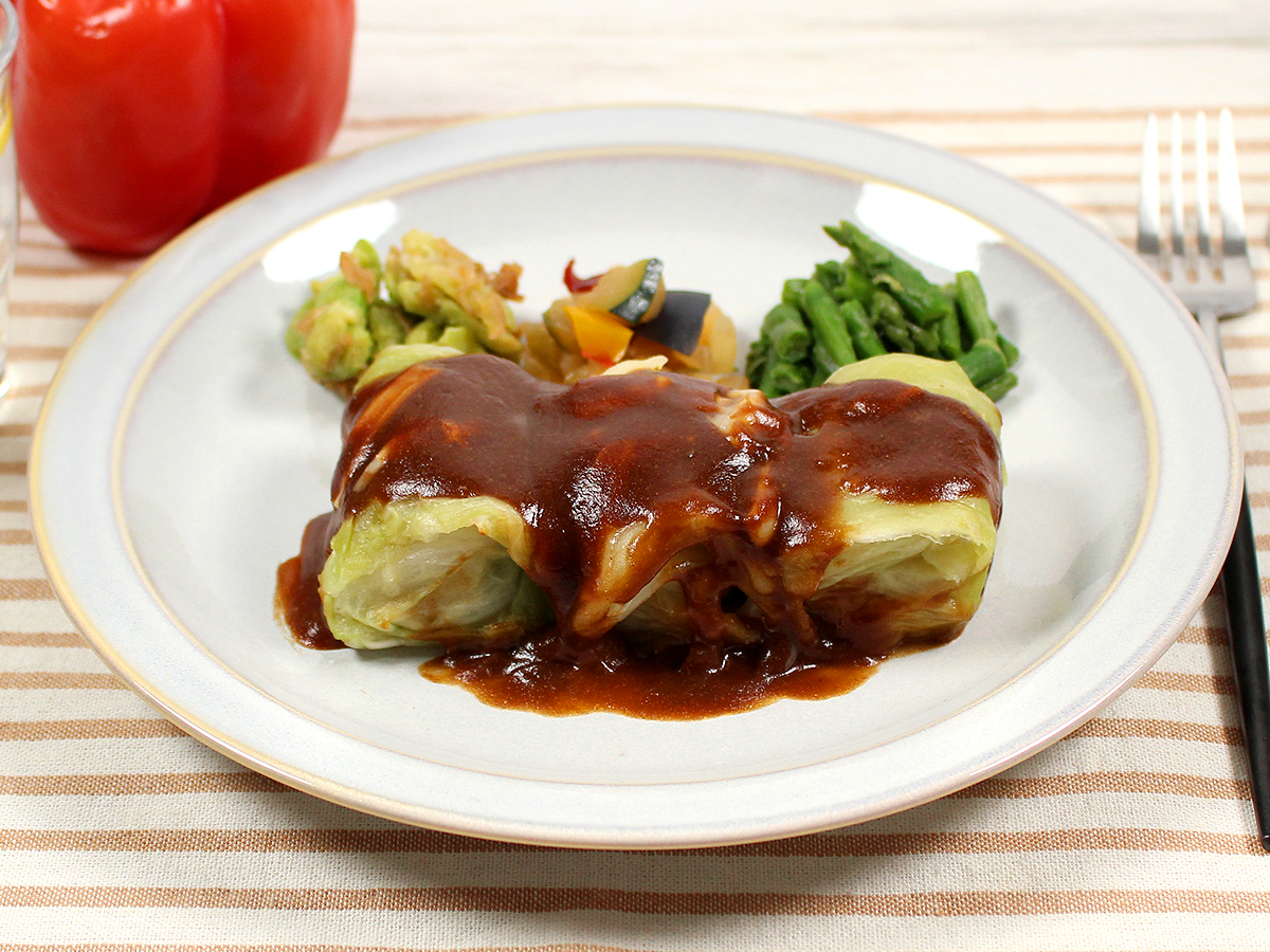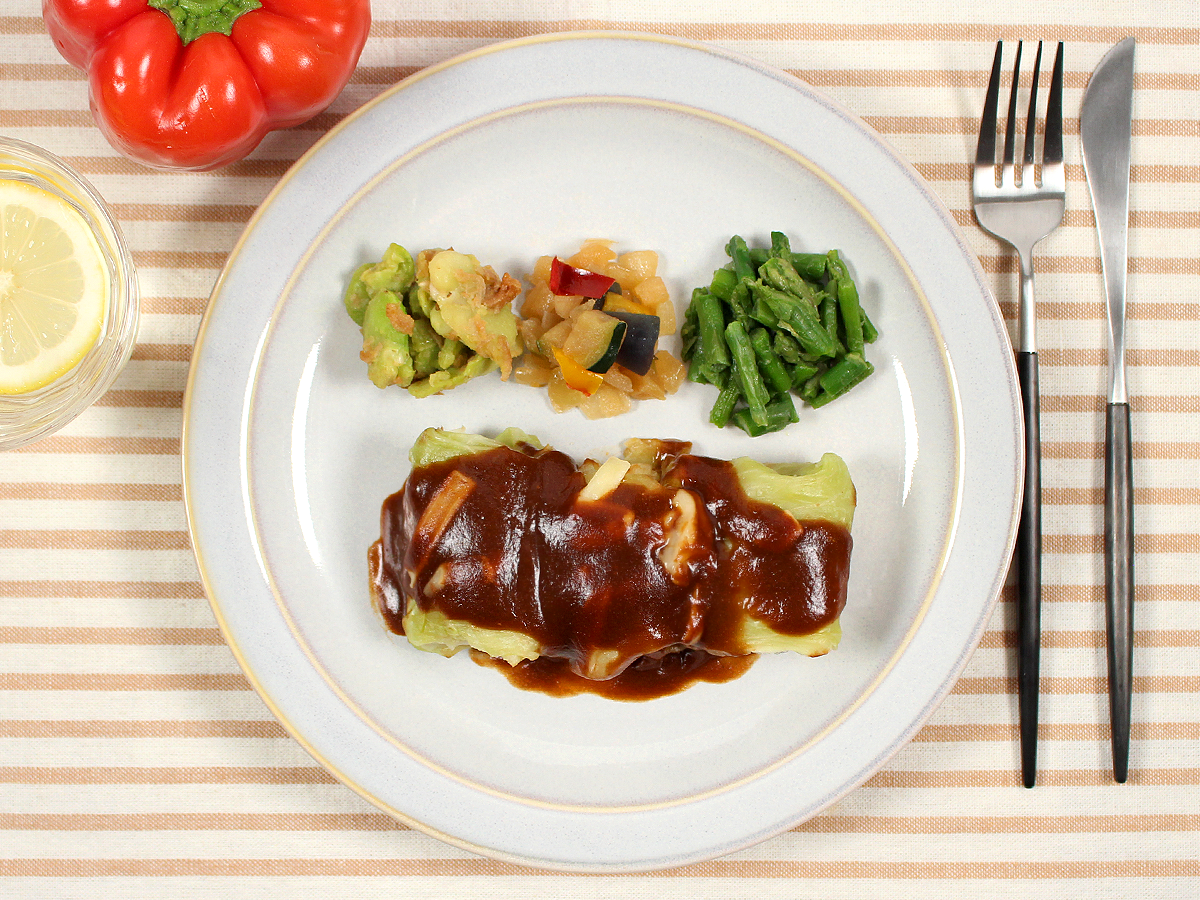 キャベツたっぷりのジューシーなロールキャベツを、濃厚なデミグラスソースで仕上げました。チーズを加えることで、よりコク深い味わいになっており、柔らかいキャベツとの相性も良いプレートです。ソースとご一緒にお召し上がり下さい。