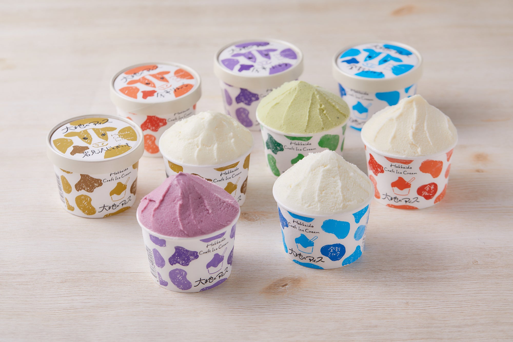 大地のアイスで人気の定番フレーバー「登別ミルク」「余市ぶどう」「余市りんご」「岩見沢じゃがいも」「和寒(わっさむ)ペポナッツ」の5種類も登場。その土地に根ざした素材を使い、フレーバー名は北海道の地名に由来しています。