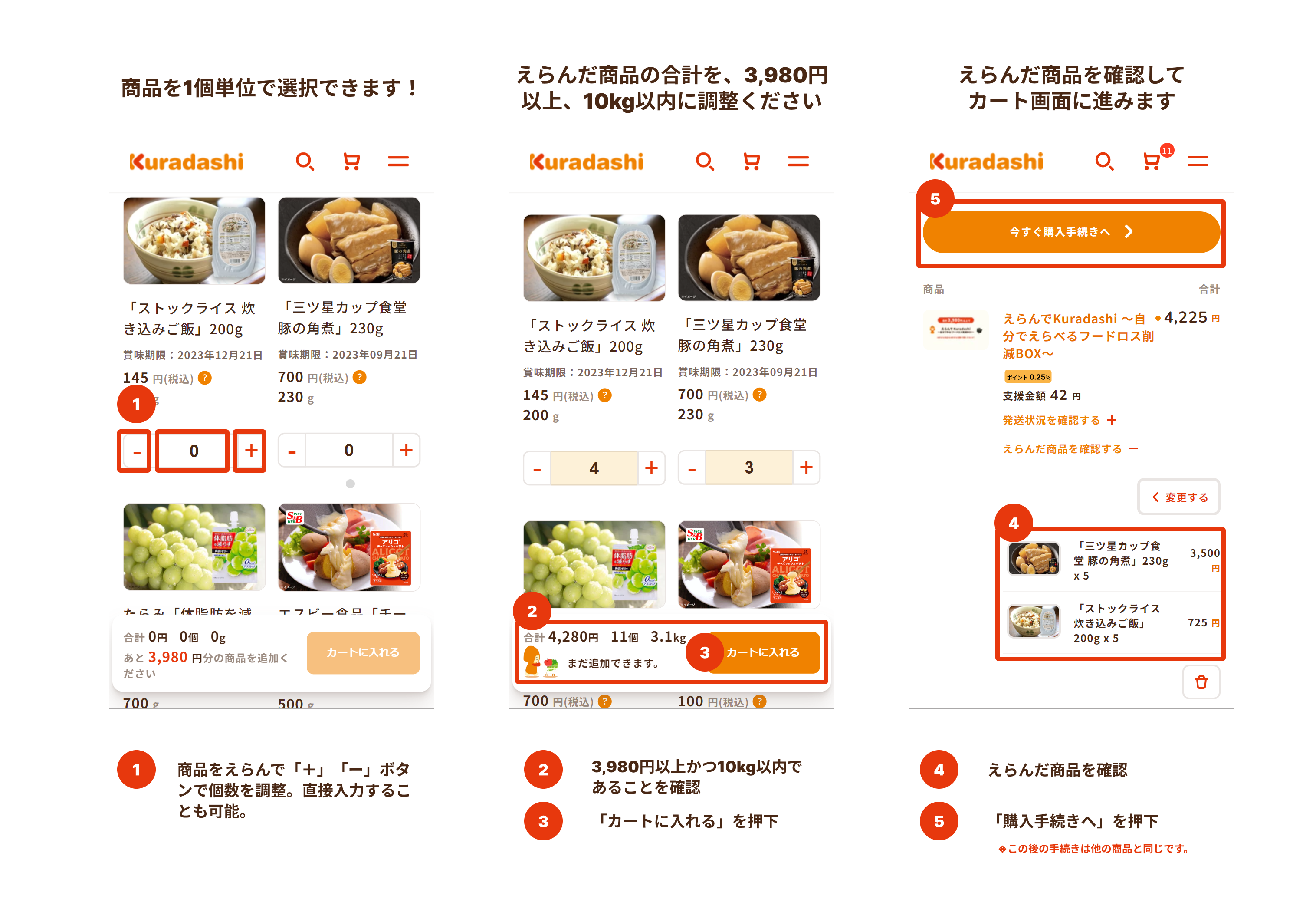 2.えらんだ商品の合計を3,980円(税込)以上かつ、10kg以内に調整し購入してください。