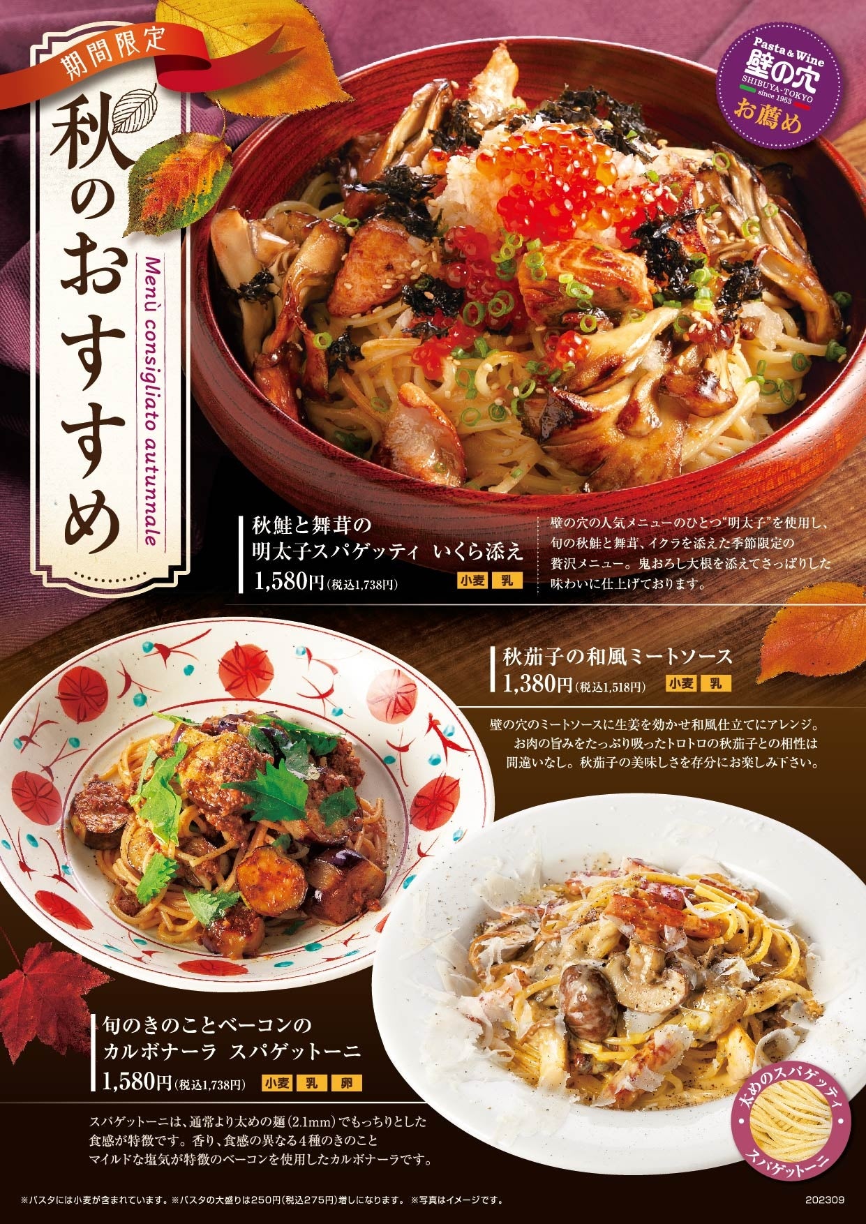 壁の穴の人気メニューのひとつ“明太子” を使用し、旬の秋鮭と舞茸、イクラを添えた季節限定の贅沢メニュー。