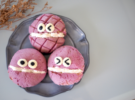 ホイップクリームとサクサクメロンパンが相性抜群! トップのクッキー生地を紫いもパウダーでハロウィン仕様にアレンジしました。 見た目はもちろん、おいしさも大満足の推しのレシピです。 パン生地はホームベーカリーにおまかせ。 焼成後の仕上げの飾り付けは、 小さなお子さまも楽しんでいただけます。